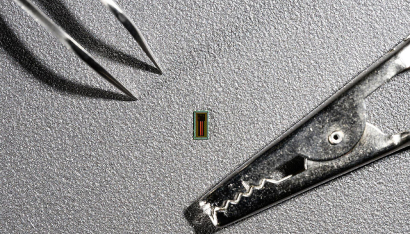 Chip MiBMI siêu nhỏ đặt cạnh một chiếc nhíp và kẹp cá sấu. Ảnh: EPFL/Lundi13-CC-BY-SA 4.0