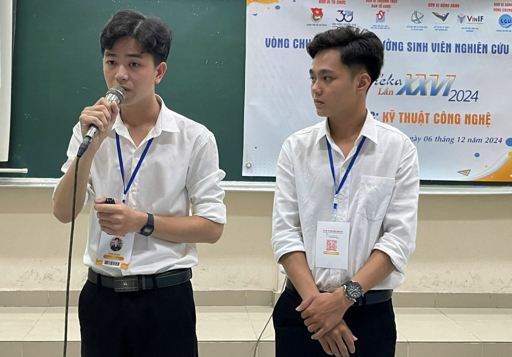Dương Chí Bảo (trái) và Phạm Hoài Bảo giới thiệu máy tách vỏ hạt sen tại cuộc thi Sinh viên nghiên cứu khoa học Euréka. Ảnh: Hà An.