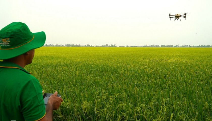 Drone nông nghiệp trên cánh đồng của ông Khanh.