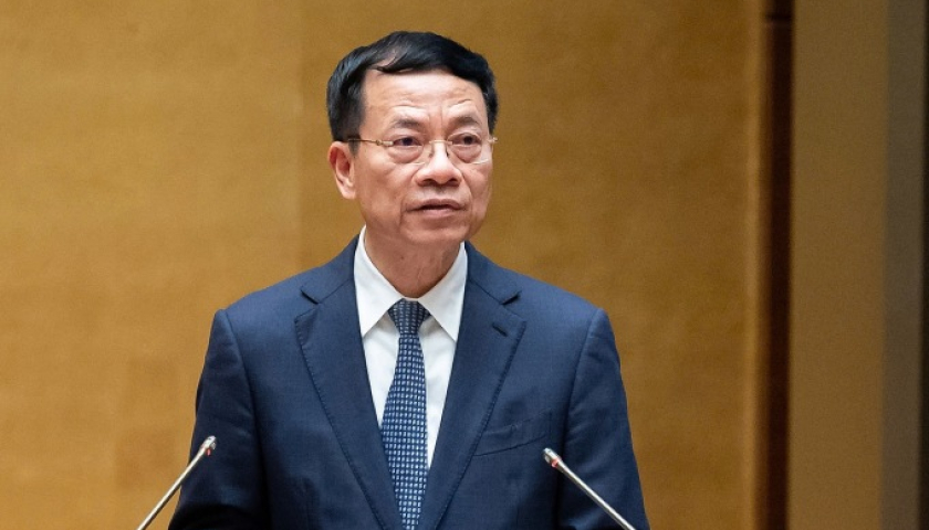 Bộ trưởng Thông tin và Truyền thông Nguyễn Mạnh Hùng trình Quốc hội dự thảo Nghị quyết, ngày 15/2. Ảnh: Media Quốc hội