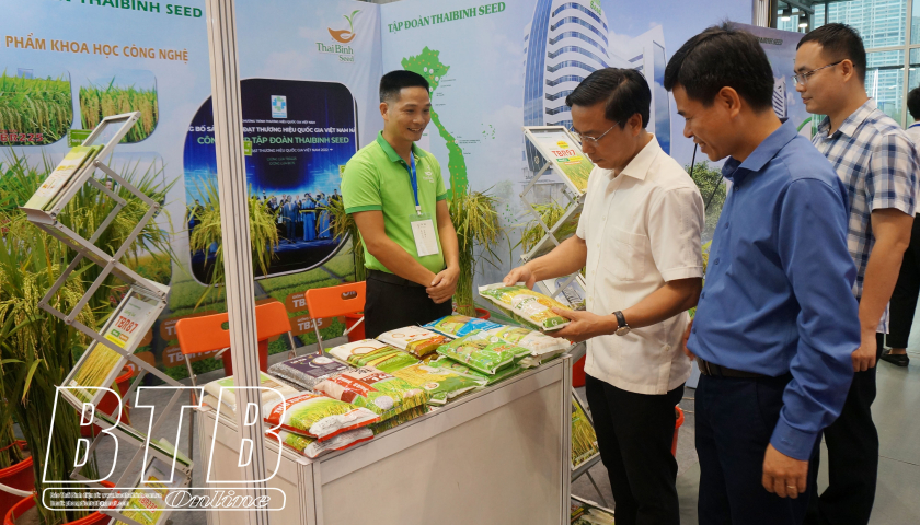 Lãnh đạo Sở Khoa học và Công nghệ tham quan khu trưng bày sản phẩm của Công ty Cổ phần Tập đoàn ThaiBinh Seed tại sự kiện kết nối công nghệ và đổi mới sáng tạo Việt Nam năm 2024.