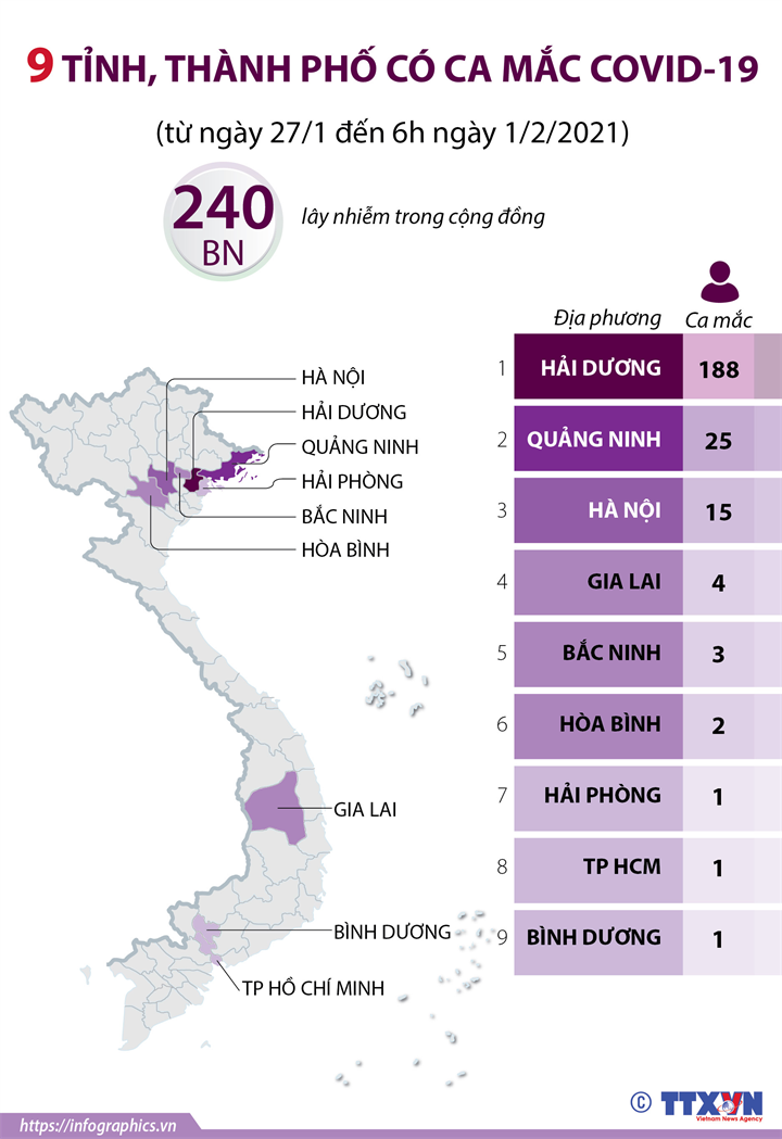 Từ ngày 27/1 đến 6h ngày 1/2/2021, đã có 240 ca mắc COVID-19 mới tại 9 tỉnh, thành phố (không tính các ca nhập cảnh).