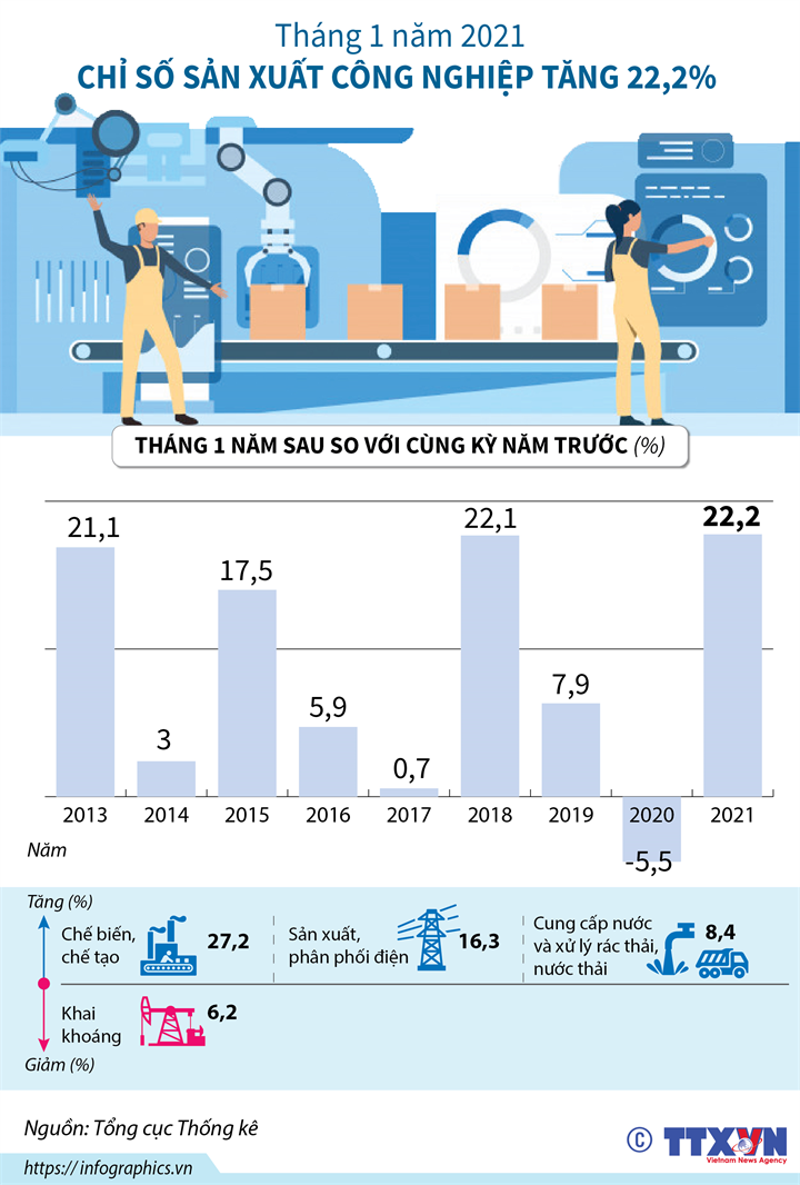 Tháng 1 năm 2021, chỉ số sản xuất công nghiệp tăng 22,2%