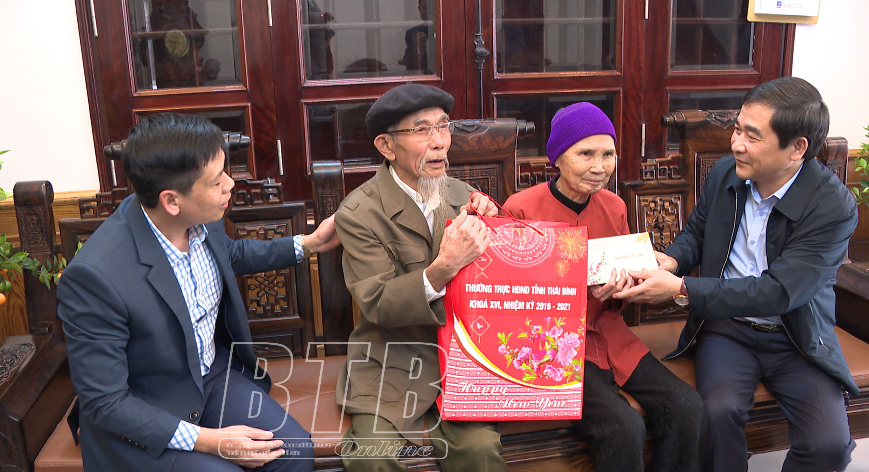 Đồng chí Nguyễn Tiến Thành, Phó Bí thư thường trực Tỉnh ủy, Chủ tịch HĐND tỉnh tặng quà, chúc tết gia đình ông Lê Xuân An, đảng viên 60 năm tuổi đảng, thôn Minh Đức, xã Bắc Sơn (Hưng Hà).
