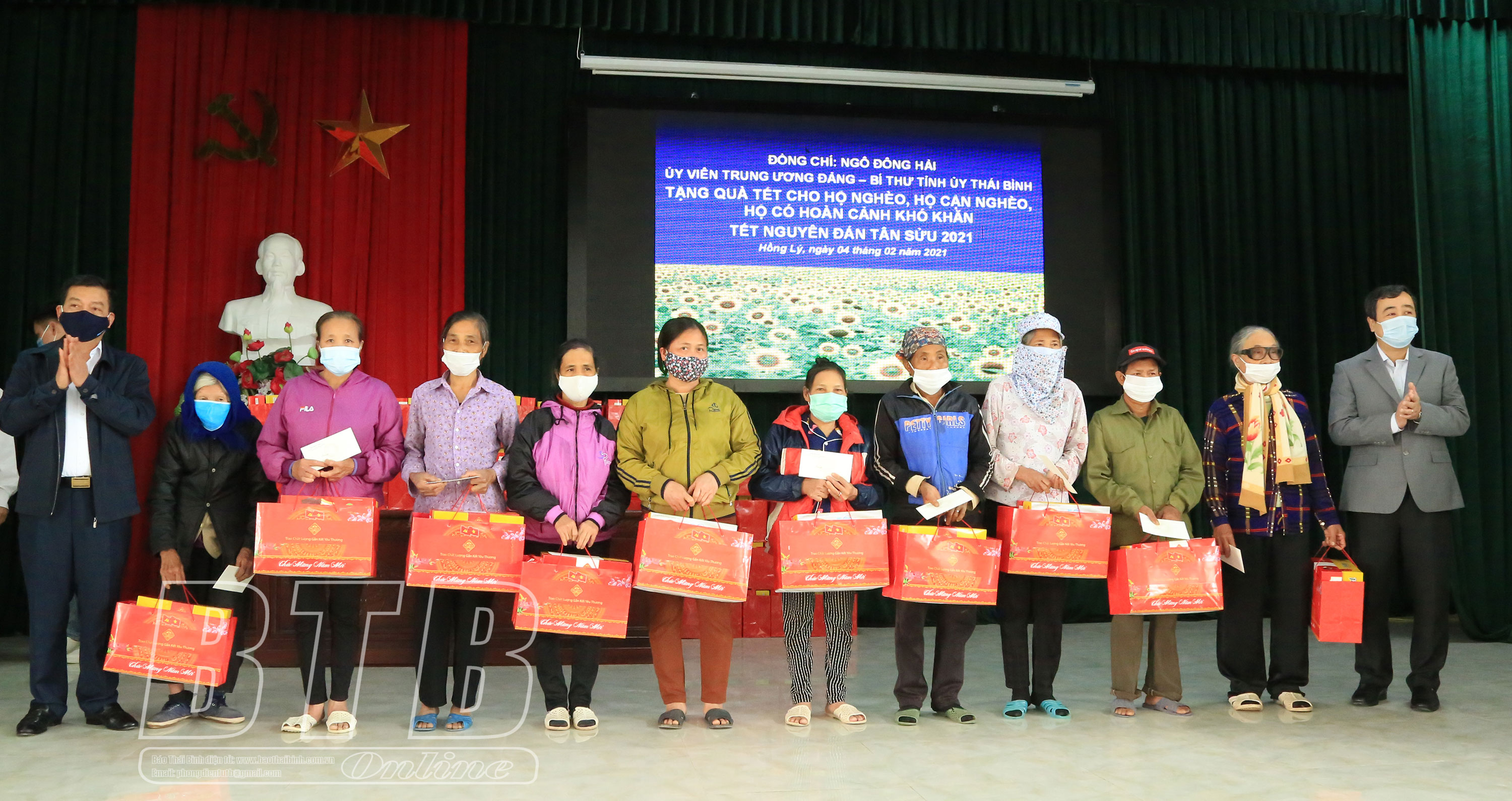 Đồng chí Ngô Đông Hải, Ủy viên Ban Chấp hành Trung ương Đảng, Bí thư Tỉnh ủy cùng lãnh đạo Văn phòng Tỉnh ủy tặng quà hộ nghèo, cận nghèo, hộ có hoàn cảnh khó khăn xã Hồng Lý. Ảnh: Thành Tâm