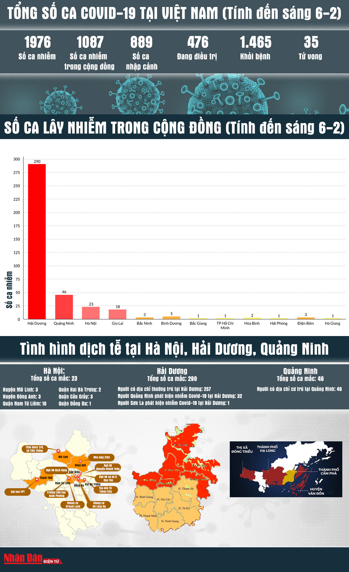 Ban Chỉ đạo quốc gia phòng, chống dịch Covid-19 cho biết, sáng 6/2, Việt Nam không có ca mắc mới Covid-19. Bộ Y tế cho biết, hiện đã có ba bệnh nhân tại Điện Biên âm tính với virus SARS-CoV-2. Như vậy, tính đến 6 giờ sáng ngày 6/2, Việt Nam có tổng cộng 1.087 ca mắc Covid-19 do lây nhiễm trong nước, trong đó. số lượng ca mắc mới tính từ ngày 27/1 đến nay: 394 ca. Dịch lan ra 12 tỉnh, thành phố sau khi Điện Biên, Hà Giang ghi nhận người nhiễm.