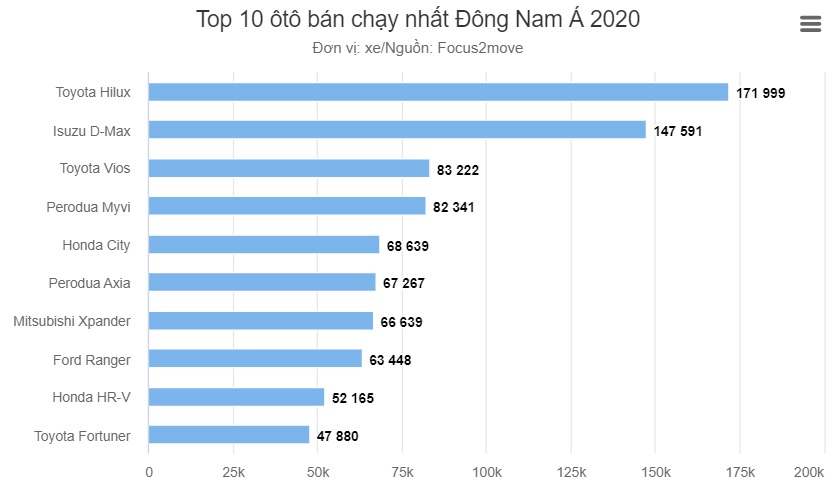 Focus2move tổng hợp số liệu từ các thị trường ở Đông Nam Á, gồm Thái Lan, Indonesia, Malaysia, Việt Nam, Philippines, Brunei, Lào, Myanmar, Campuchia. Danh sách top 10 mẫu xe bán chạy nhất khu vực thống trị bởi các thương hiệu Nhật.