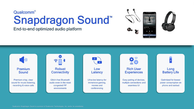 Tập đoàn Qualcomm Technologies International mới đây đã công bố nền tảng công nghệ Qualcomm Snapdragon Sound, chuỗi đổi mới sáng tạo và phần mềm âm thanh được thiết kế để đem đến âm thanh liền mạch và sống động trên thiết bị cũng như giữa các thiết bị bao gồm điện thoại thông minh, tai nghe không dây và headsets. Snapdragon Sound sẽ cung cấp trải nghiệm âm thanh vượt trội cho người dùng khi nghe nhạc trực tuyến, gọi điện và chơi game không dây.
