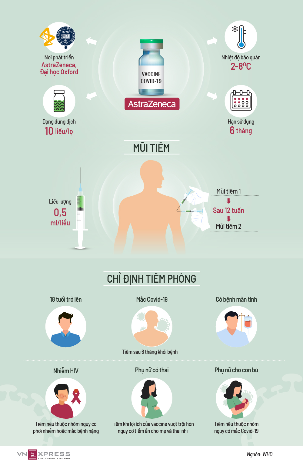Vaccine AstraZeneca do hãng dược AstraZeneca và Đại học Oxford, Anh, phát triển, có thể tiêm cho người trên 18 tuổi, phụ nữ mang thai hoặc đang cho con bú...