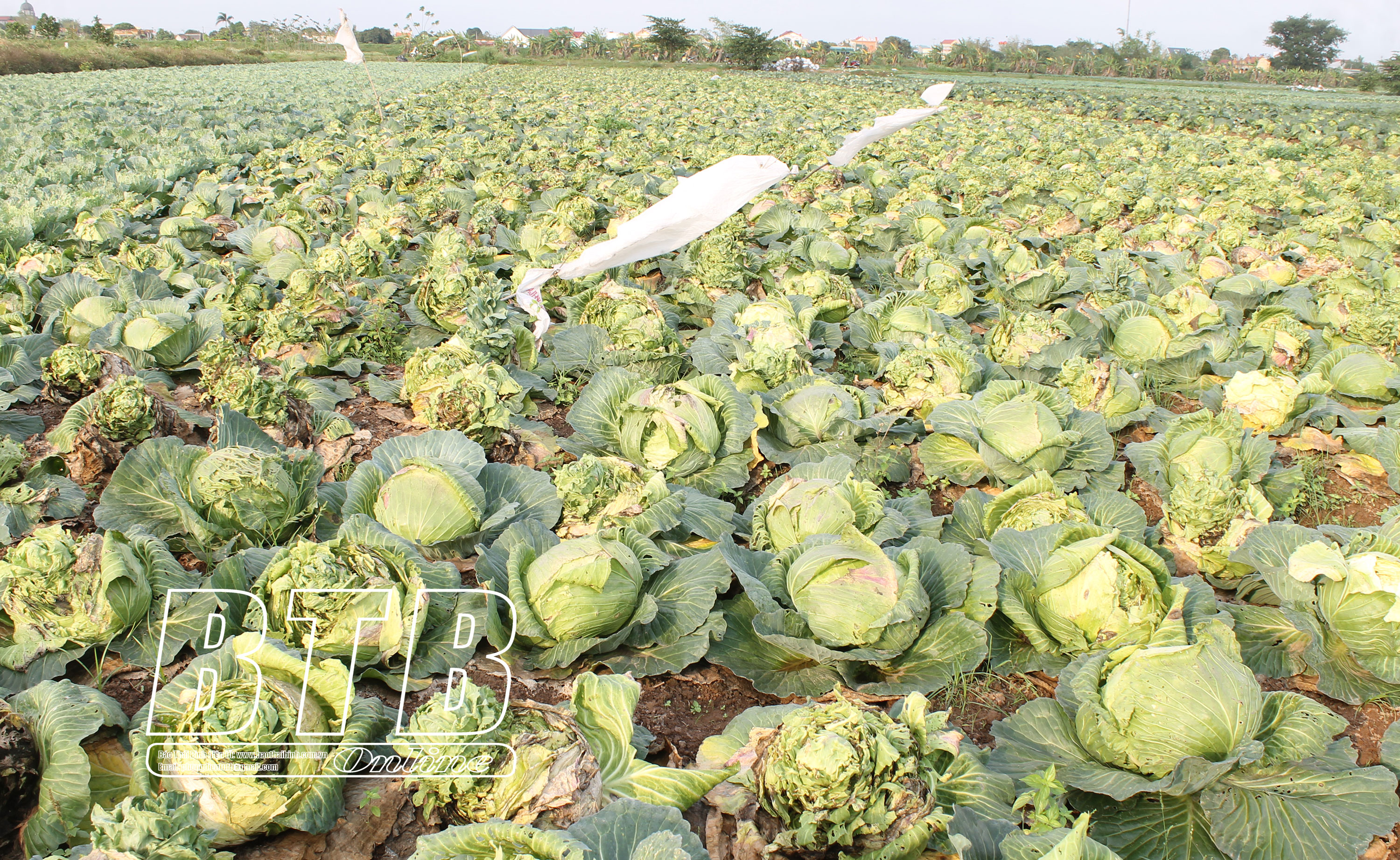 Nhiều ruộng rau bắp cải của nông dân Vũ Vân bị thối, hỏng do không tiêu thụ được.