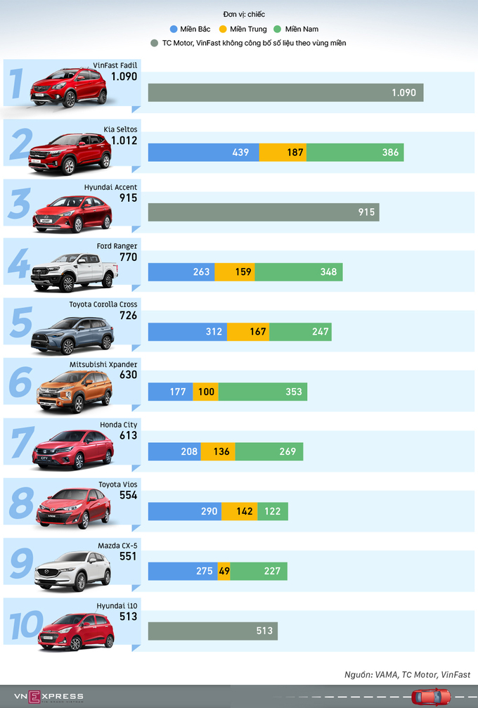 Danh sách các mẫu xe bán chạy nhất thị trường tiếp tục có nhiều xáo trộn. Vios tụt dốc rơi xuống thứ 8, trong khi Mitsubishi Xpander bán 630 xe và rơi xuống thứ 6 từ ngôi số một hồi tháng 1. VinFast Fadil lập đỉnh doanh số toàn thị trường lần đầu tiên xét trong một tháng và cho thấy khả năng thách thức hai mẫu xe giá rẻ Hàn Quốc, Kia Morning và Hyundai i10.