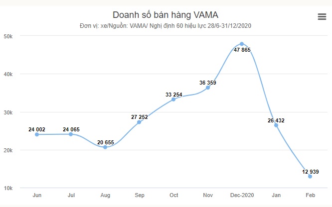 Báo cáo của Hiệp hội các nhà sản xuất ôtô Việt Nam (VAMA) cho biết, lượng bán hàng của các thành viên đạt 12.939 xe (chưa gồm chassis xe buýt) trong tháng 2, giảm 47% so với tháng trước. Đây là lần thứ hai liên tiếp, sức mua ôtô sụt giảm.