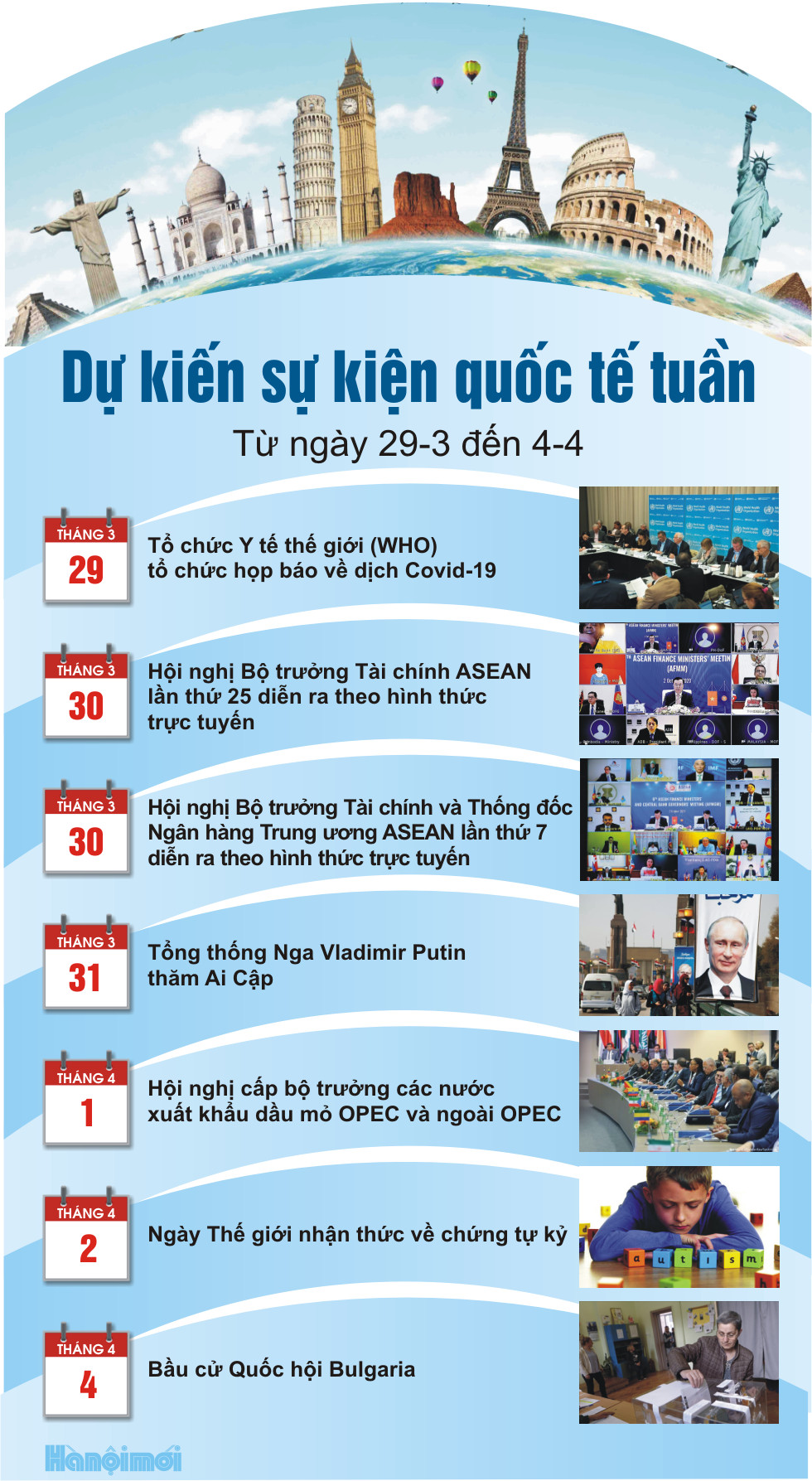 Các sự kiện quốc tế đáng chú ý dự kiến sẽ diễn ra trong tuần từ ngày 29/3 đến 4/4.