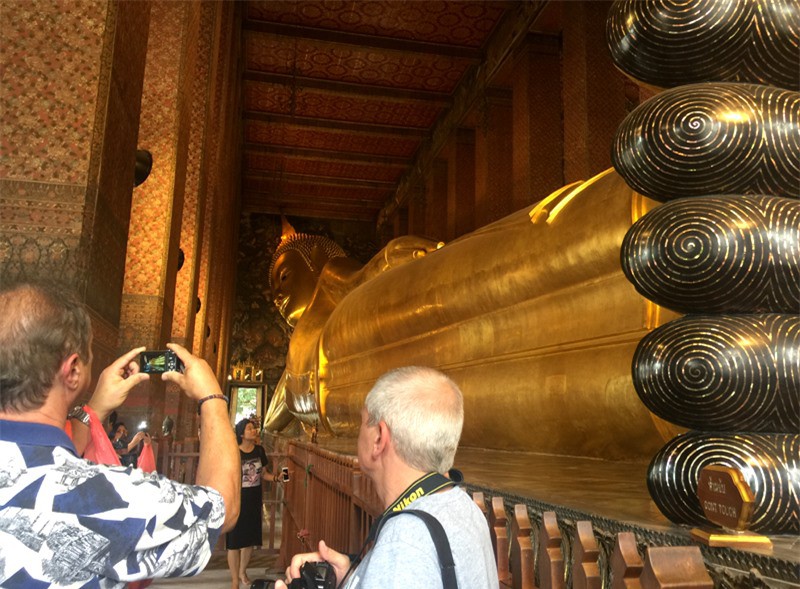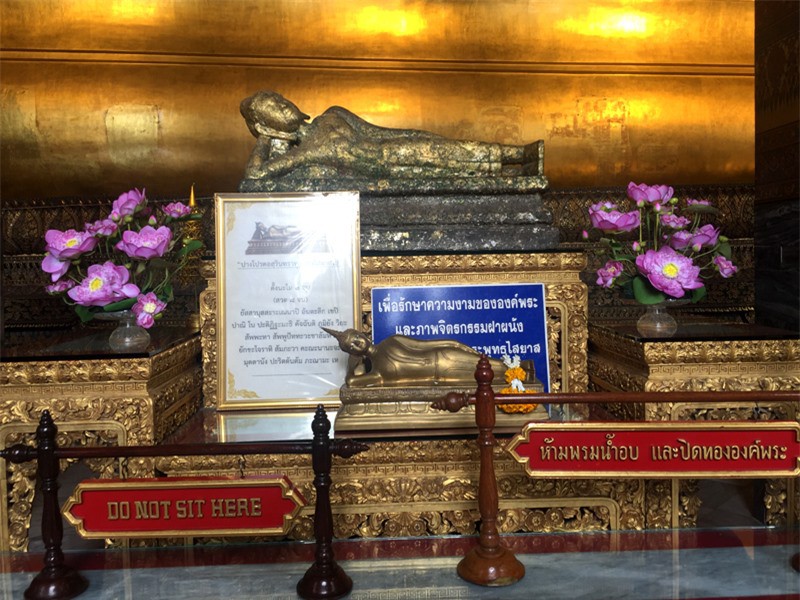 Chùa Wat Pho thu hút khách thập phương vì sự nổi tiếng của bức tượng Phật nằm, dài 46m và cao 15m. Tượng được đổ bằng thạch cao, bên ngoài được phủ kín bằng vàng lá, nằm trên một bệ cũng được dát vàng sáng chói, chạm khắc trang trí rất tỉ mỉ.