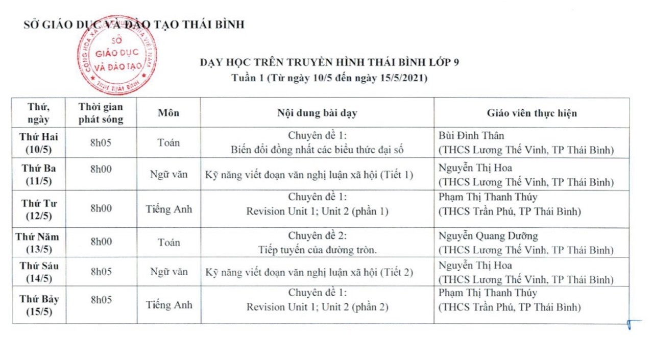 Lịch phát sóng dạy và học trên Báo Thái Bình điện tử, Đài PT -TH Thái Bình từ ngày 10/5 đến ngày 15/5/2021 như sau: