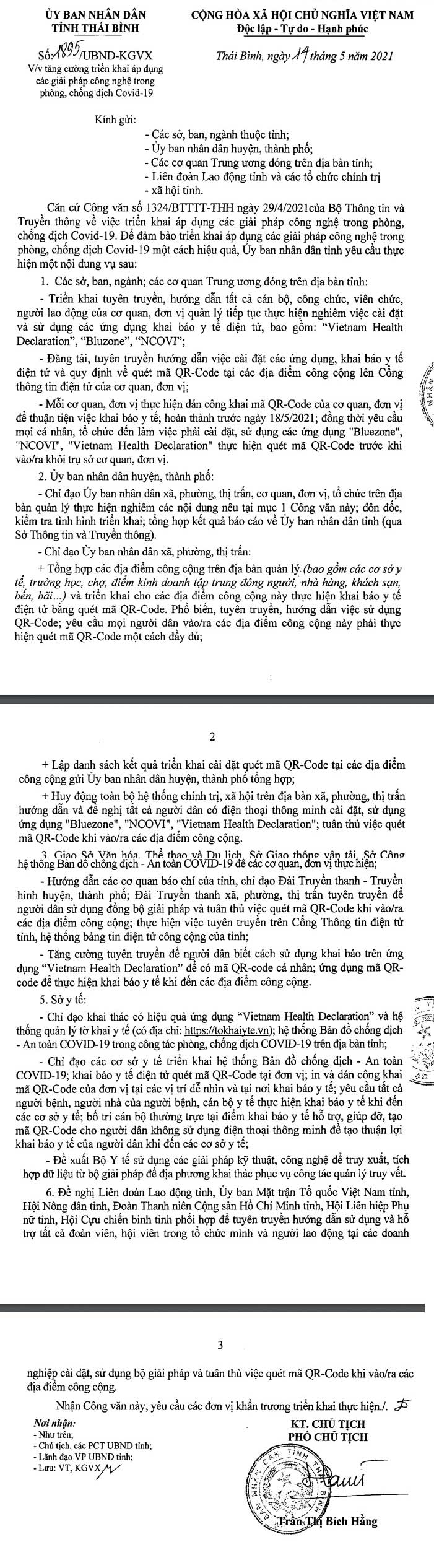 Ngày 14/5 của UBND tỉnh Thái Bình ban hành Công văn số 1895/UBND-KGVX về việc tăng cường triển khai áp dụng các giải pháp công nghệ trong phòng, chống dịch Covid-19.