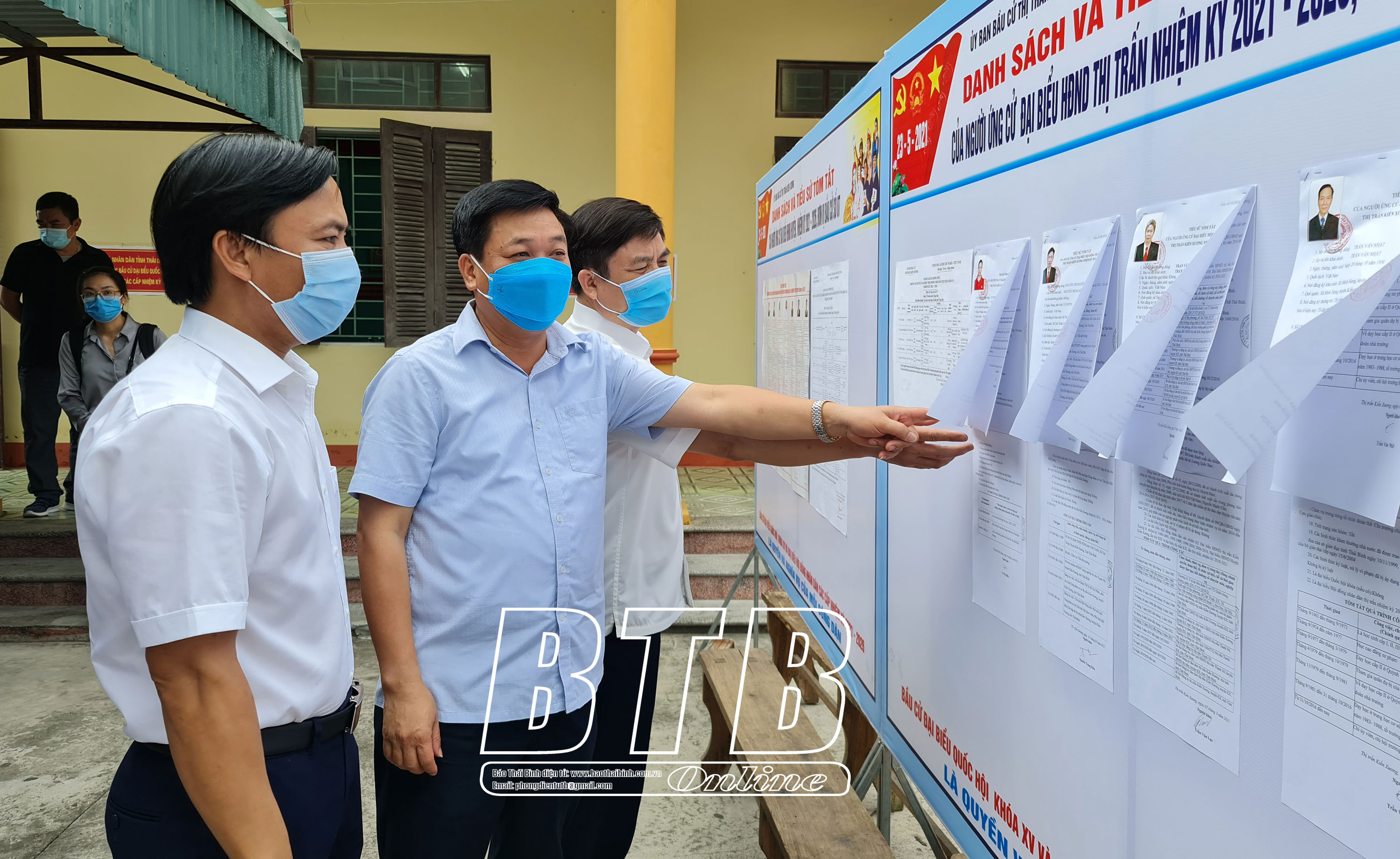 Đồng chí Phó Chủ tịch thường trực UBND tỉnh, Phó Chủ tịch Ủy ban bầu cử tỉnh kiểm tra việc niêm yết danh sách các ứng cử viên tại khu vực bầu cử tổ dân phố Cộng Hoà.