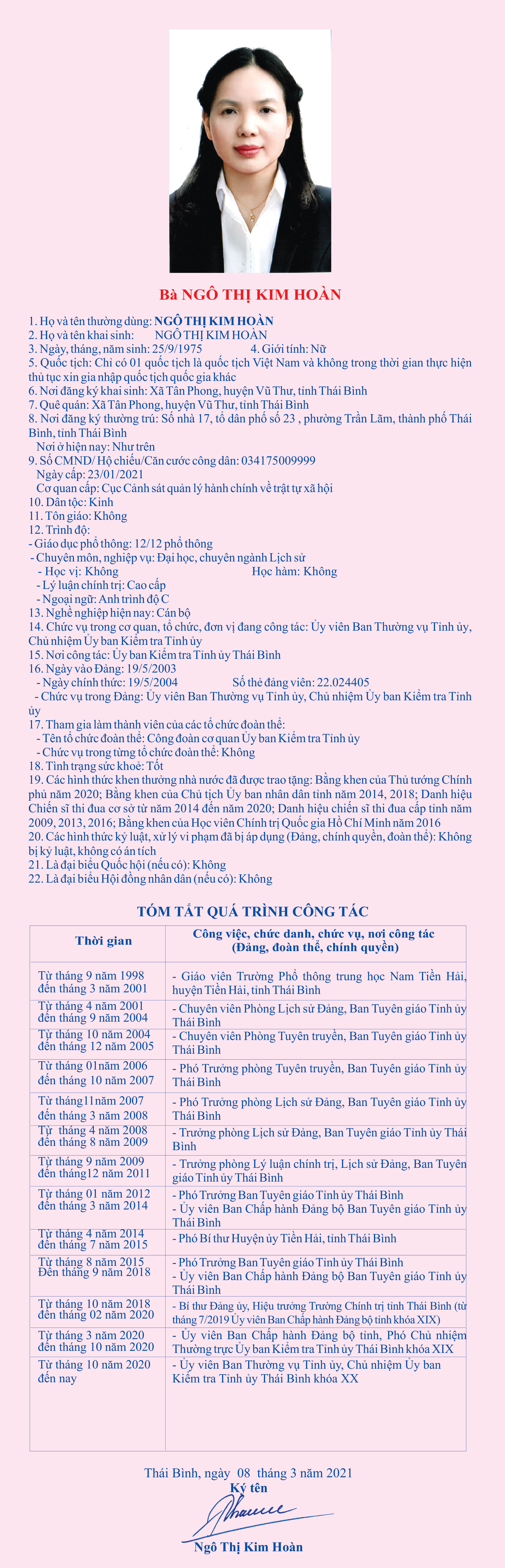 Tiểu sử, chương trình hành động của bà Ngô Thị Kim Hoàn, Ủy viên Ban Thường vụ, Chủ nhiệm Ủy ban Kiểm tra Tỉnh ủy, ứng cử đại biểu HĐND tỉnh khóa XVII, nhiệm kỳ 2021 - 2026, đơn vị bầu cử số 9, huyện Tiền Hải.