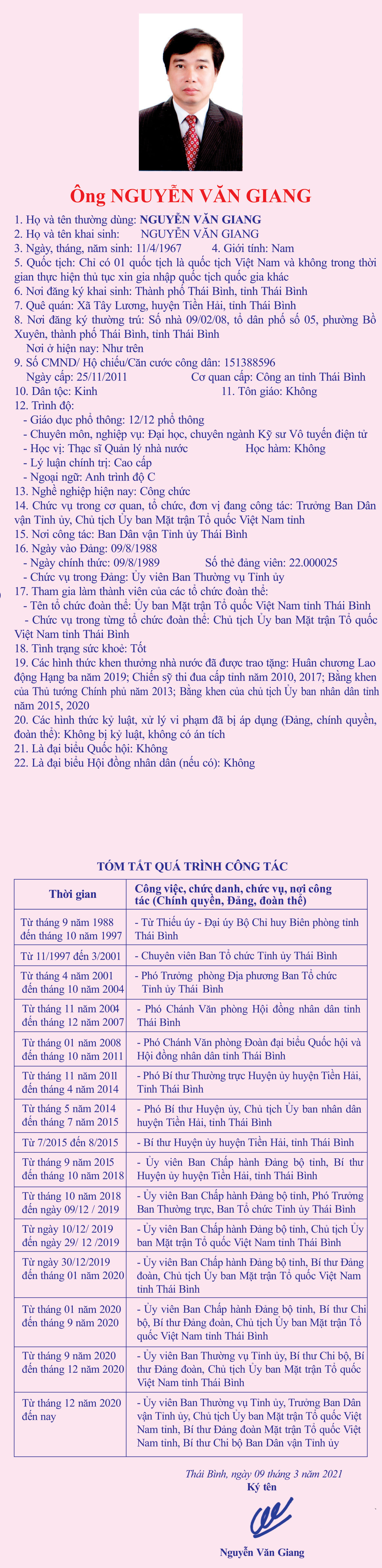 Tiểu sử, chương trình hành động của ông Nguyễn Văn Giang, Ủy viên Ban Thường vụ, Trưởng ban Dân vận Tỉnh ủy, Chủ tịch Ủy ban Mặt trận Tổ quốc Việt Nam tỉnh, ứng cử đại biểu HĐND tỉnh khóa XVII, nhiệm kỳ 2021 - 2026, đơn vị bầu cử số 1, huyện Hưng Hà.
