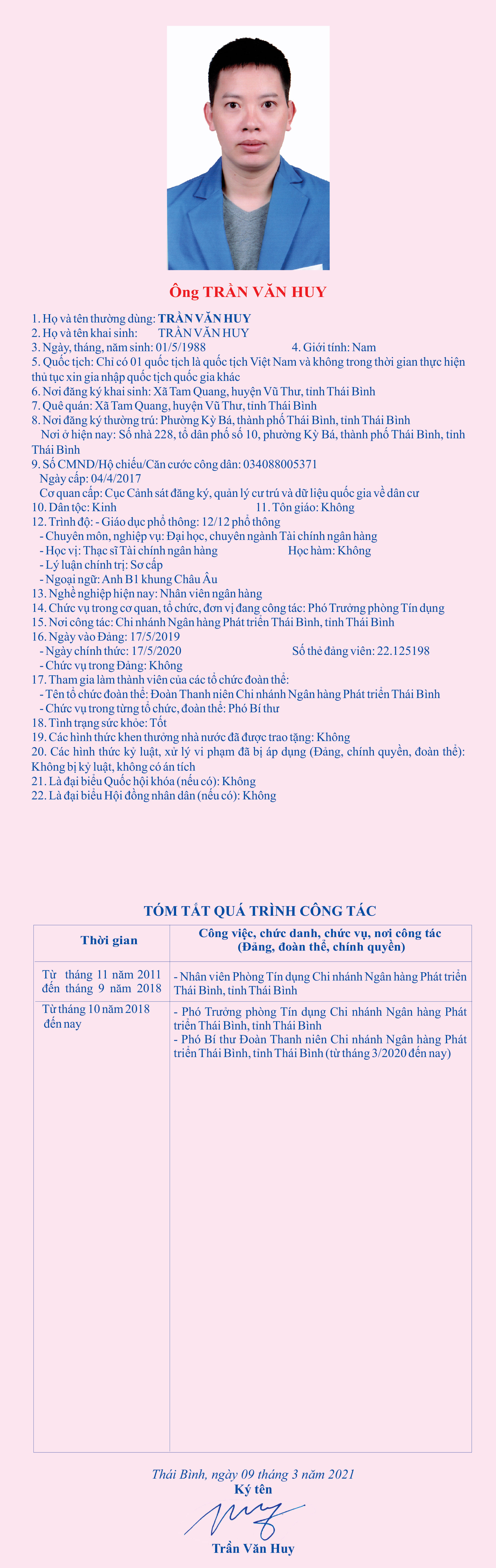 Tiểu sử, chương trình hành động của ông Trần Văn Huy, nhân viên ngân hàng, Phó Trưởng phòng Tín dụng, Phó Bí thư Đoàn Thanh niên Chi nhánh Ngân hàng Phát triển tỉnh Thái Bình, ứng cử đại biểu HĐND tỉnh khóa XVII, nhiệm kỳ 2021 - 2026, đơn vị bầu cử số 9, huyện Tiền Hải.