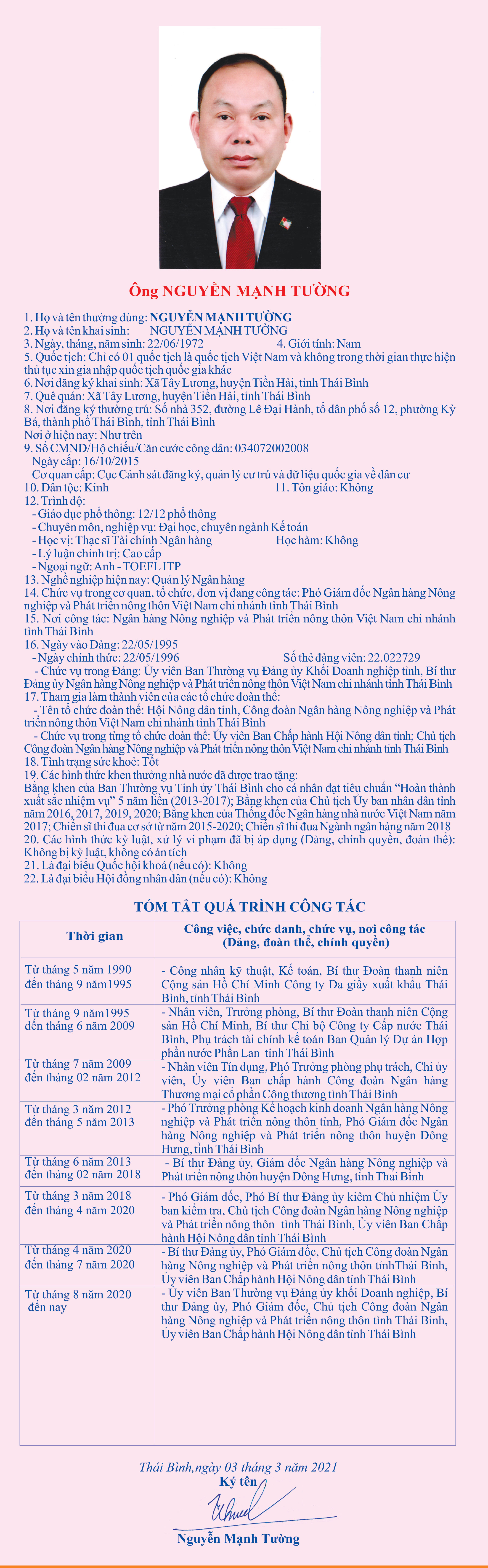 Tiểu sử, chương trình hành động của ông Nguyễn Mạnh Tường, Phó Giám đốc Ngân hàng Nông nghiệp và Phát triển nông thôn Việt Nam chi nhánh tỉnh Thái Bình, ứng cử đại biểu HĐND tỉnh khóa XVII