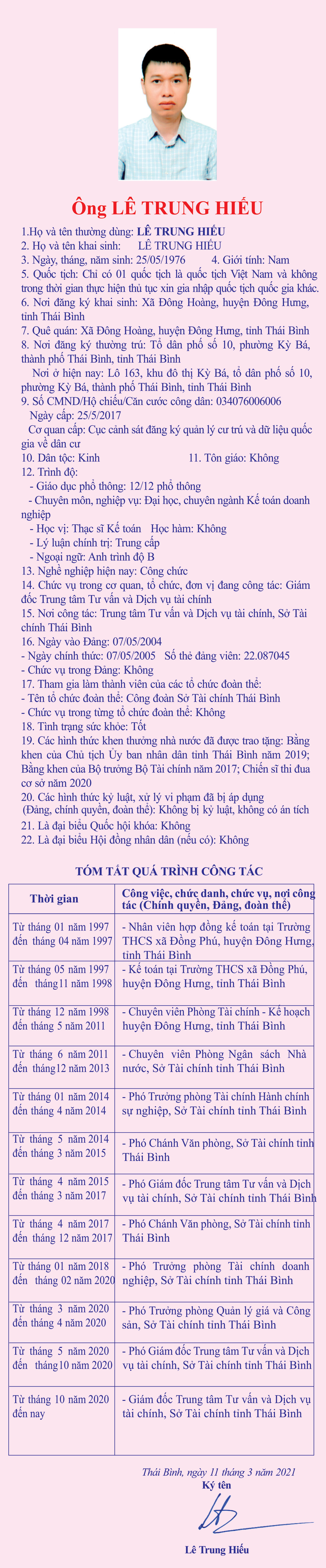 Tiểu sử, chương trình hành động của ông Lê Trung Hiếu, Giám đốc Trung tâm Tư vấn và Dịch vụ tài chính, Sở Tài chính tỉnh Thái Bình ứng cử đại biểu HĐND tỉnh khóa XVII