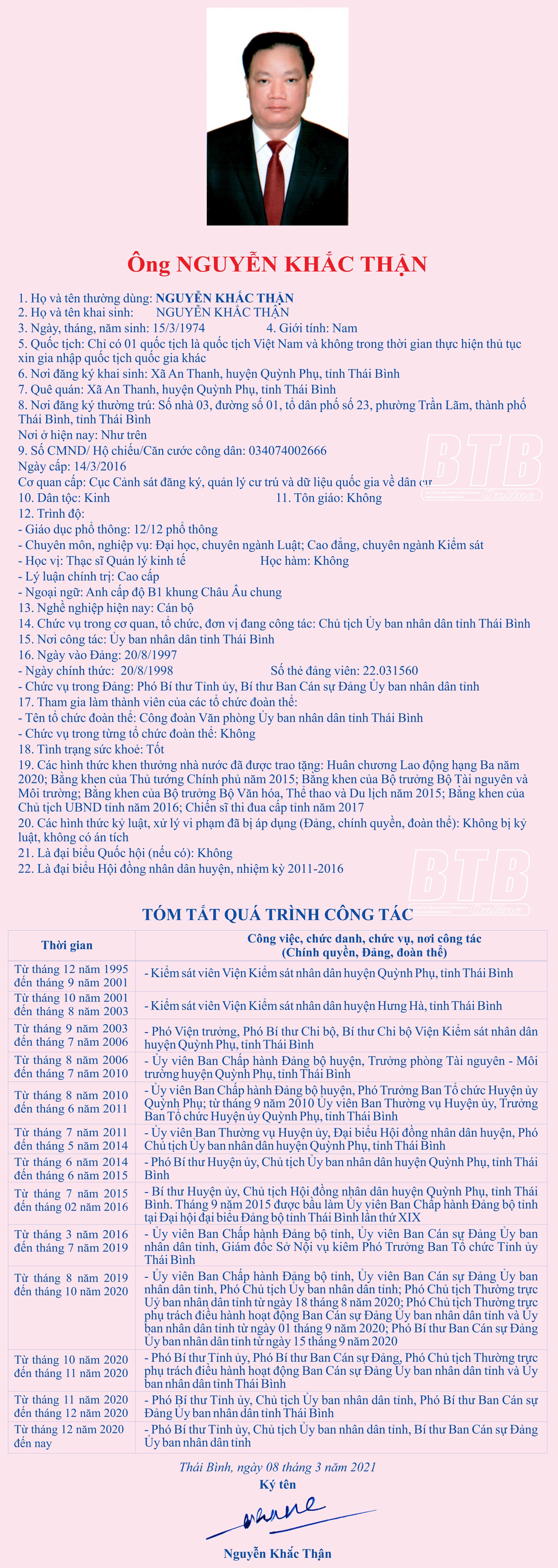 Tiểu sử, chương trình hành động của ông Nguyễn Khắc Thận, Phó Bí thư Tỉnh ủy, Chủ tịch UBND tỉnh, ứng cử đại biểu HĐND tỉnh khóa XVII, nhiệm kỳ 2021 - 2026, đơn vị bầu cử số 16, thành phố Thái Bình.