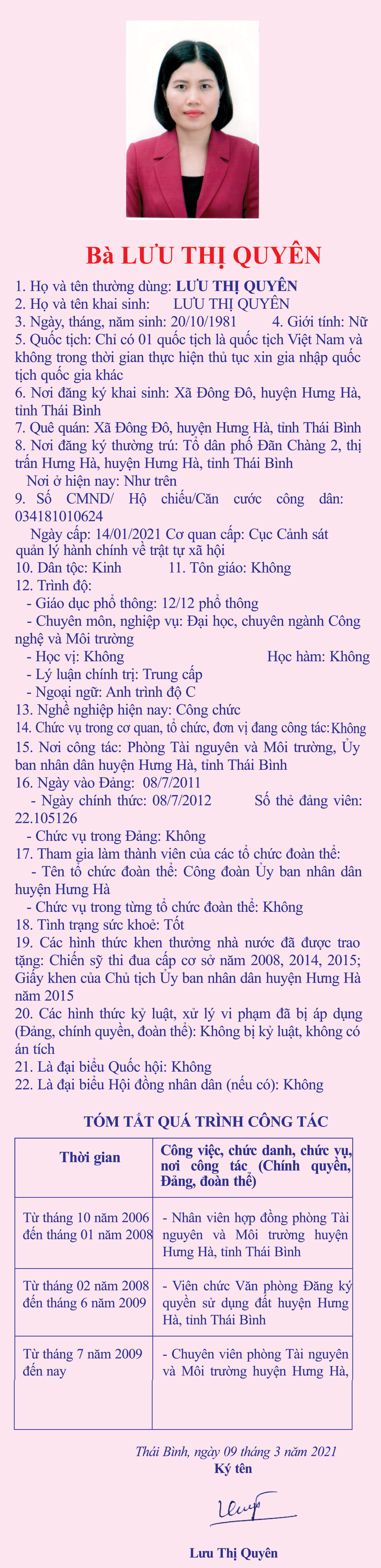 Tiểu sử, chương trình hành động của bà Lưu Thị Quyên, chuyên viên Phòng Tài nguyên và Môi trường, Ủy ban nhân dân huyện Hưng Hà, tỉnh Thái Bình, ứng cử đại biểu HĐND tỉnh khóa XVII, nhiệm kỳ 2021 - 2026, đơn vị bầu cử số 2, huyện Hưng Hà.
