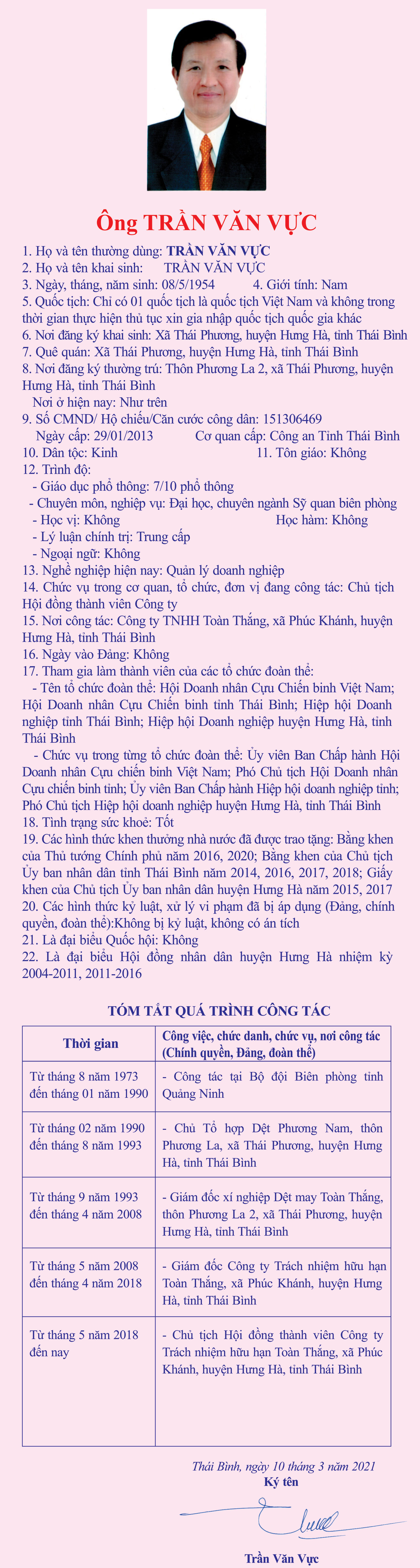 Tiểu sử, chương trình hành động của ông Trần Văn Vực, Quản lý doanh nghiệp, Chủ tịch Hội đồng thành viên Công ty TNHH Toàn Thắng, Ủy viên Ban Chấp hành Hội Doanh nhân Cựu chiến binh Việt Nam, Phó Chủ tịch Hội Doanh nhân Cựu chiến binh tỉnh, Ủy viên Ban Chấp hành Hiệp hội doanh nghiệp tỉnh, Phó Chủ tịch Hiệp hội Doanh nghiệp huyện Hưng Hà, ứng cử đại biểu HĐND tỉnh khóa XVII, nhiệm kỳ 2021 - 2026, đơn vị bầu cử số 2, huyện Hưng Hà.