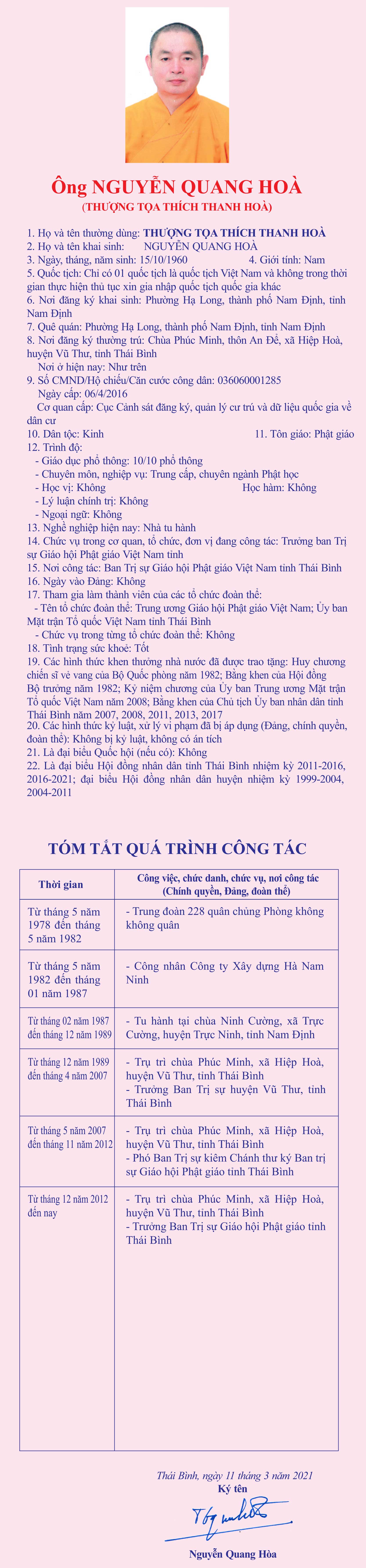 Tiểu sử, chương trình hành động của ông Nguyễn Quang Hòa (Thượng tọa Thích Thanh Hòa), Trưởng ban Trị sự Giáo hội Phật giáo Việt Nam tỉnh Thái Bình, ứng cử đại biểu HĐND tỉnh khóa XVII, nhiệm kỳ 2021 - 2026, đơn vị bầu cử số 16, thành phố Thái Bình.