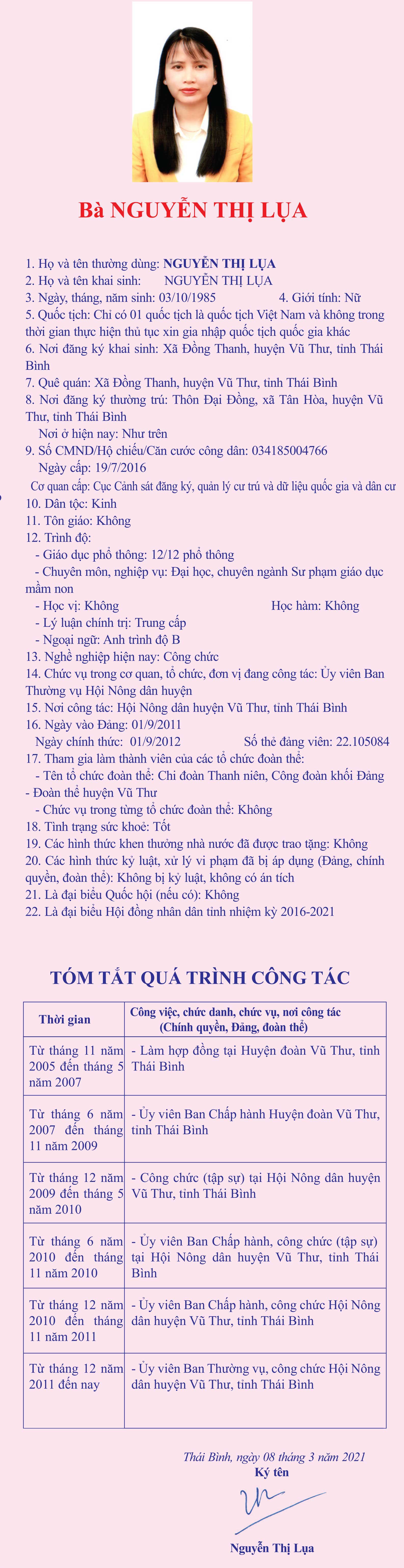 Tiểu sử, chương trình hành động của bà Nguyễn Thị Lụa, chuyên viên Hội Nông dân huyện Vũ Thư, ứng cử đại biểu HĐND tỉnh khóa XVII, nhiệm kỳ 2021 - 2026, đơn vị bầu cử số 13, huyện Vũ Thư.