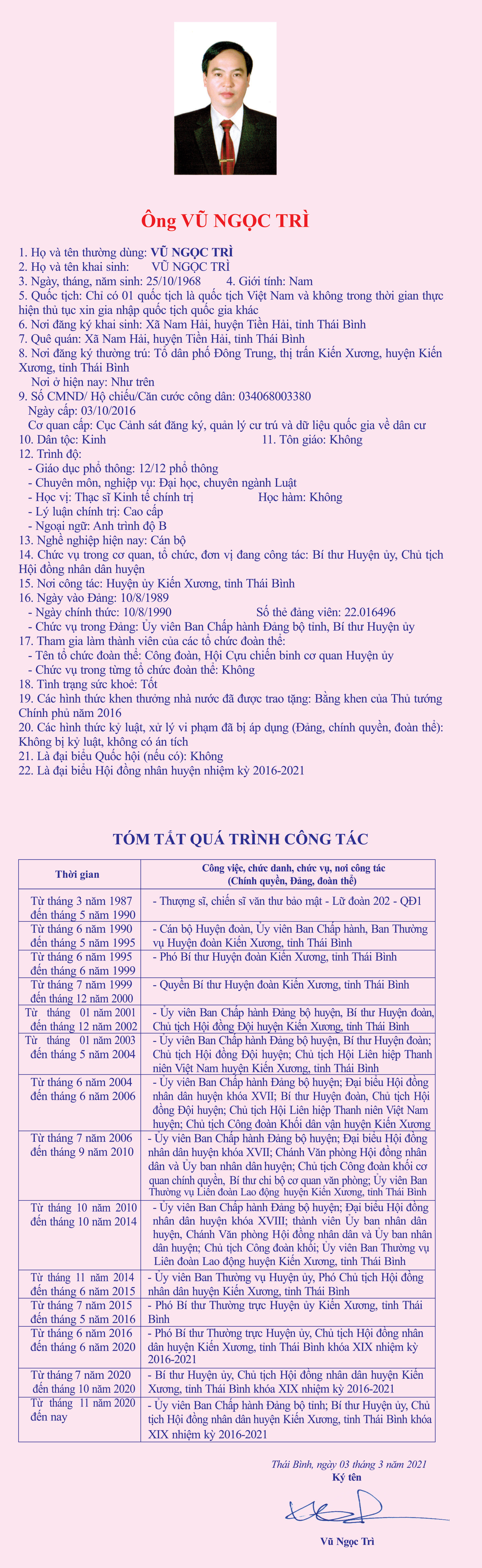Tiểu sử, chương trình hành động của ông Vũ Ngọc Trì, Tỉnh ủy viên, Bí thư Huyện ủy, Chủ tịch Hội đồng nhân dân huyện Kiến Xương, ứng cử đại biểu HĐND tỉnh khóa XVII
