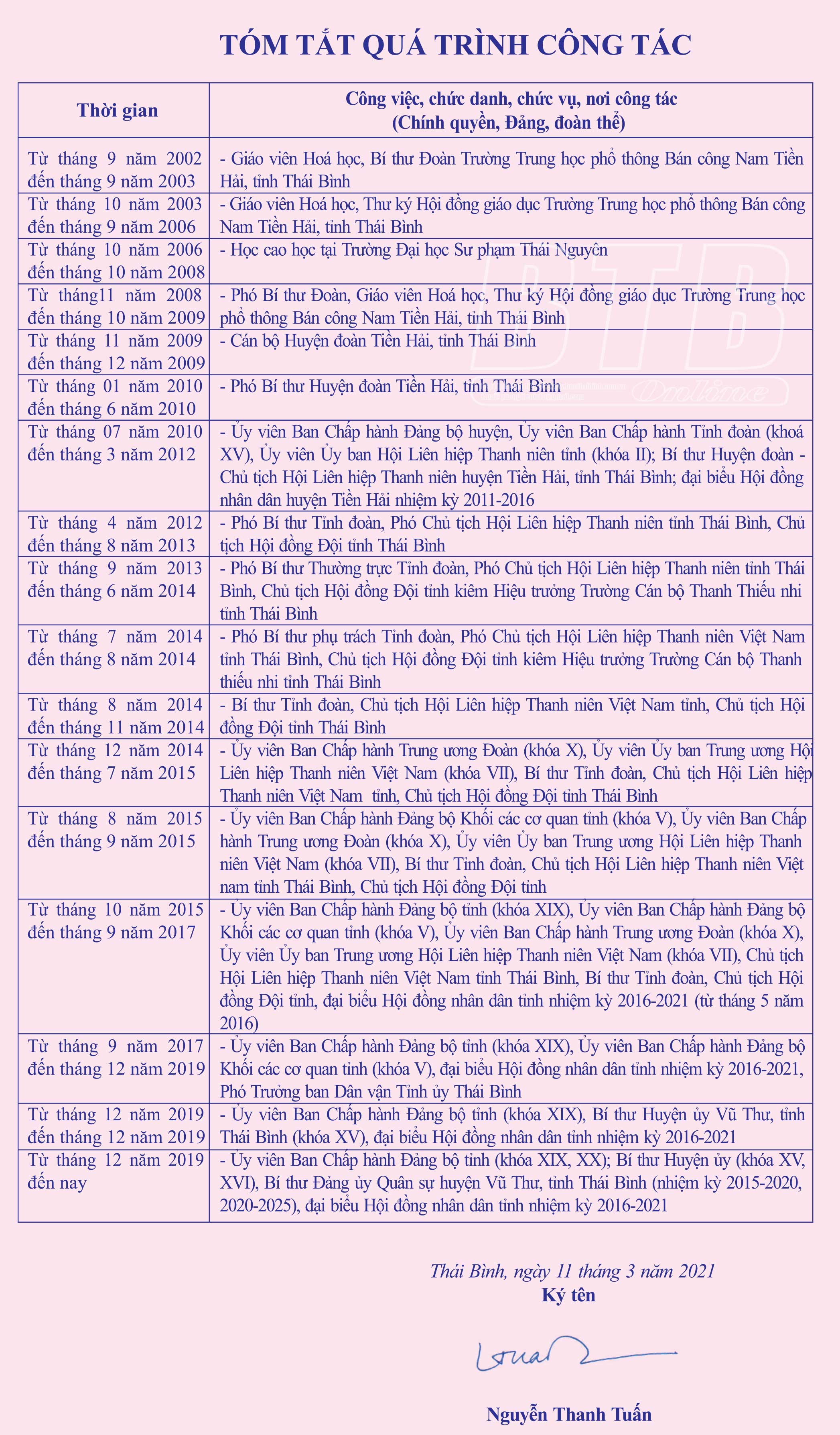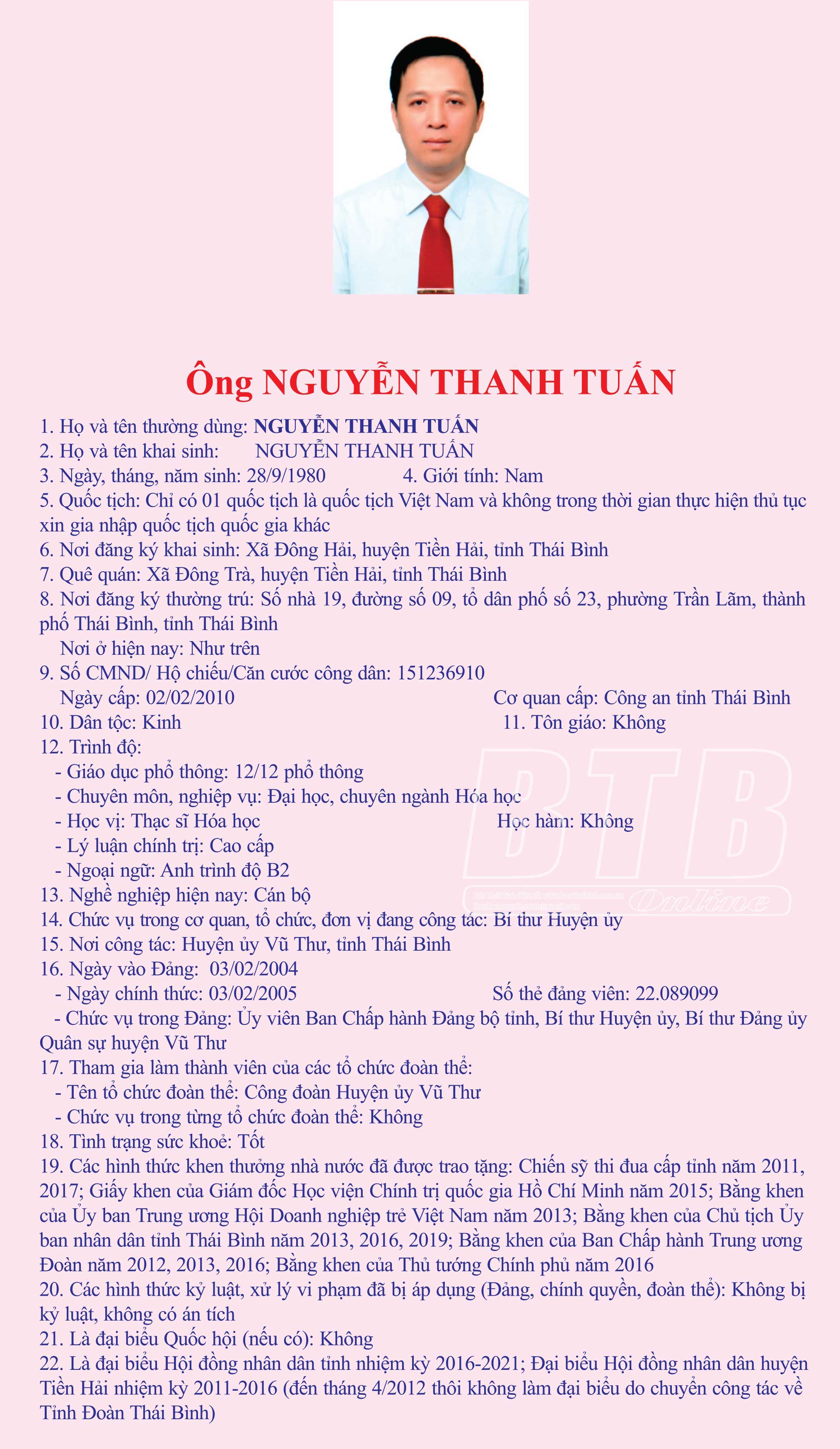 Tiểu sử, chương trình hành động của ông Nguyễn Thanh Tuấn, Tỉnh ủy viên, Bí thư Huyện ủy huyện Vũ Thư, ứng cử đại biểu HĐND tỉnh khóa XVII, nhiệm kỳ 2021 - 2026, đơn vị bầu cử số 14, huyện Vũ Thư