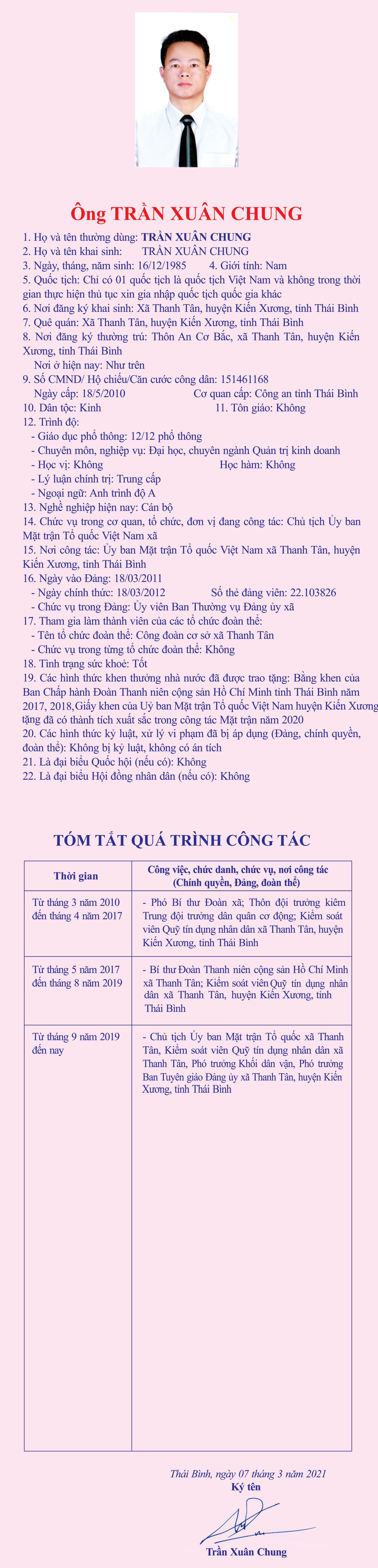 Tiểu sử, chương trình hành động của ông Trần Xuân Chung, Ủy viên Ban Thường vụ Đảng ủy xã, Chủ tịch Ủy ban Mặt trận Tổ quốc Việt Nam xã Thanh Tân, huyện Kiến Xương, ứng cử đại biểu HĐND tỉnh khóa XVII nhiệm kỳ 2021 - 2026, đơn vị bầu cử số 12, huyện Kiến Xương.