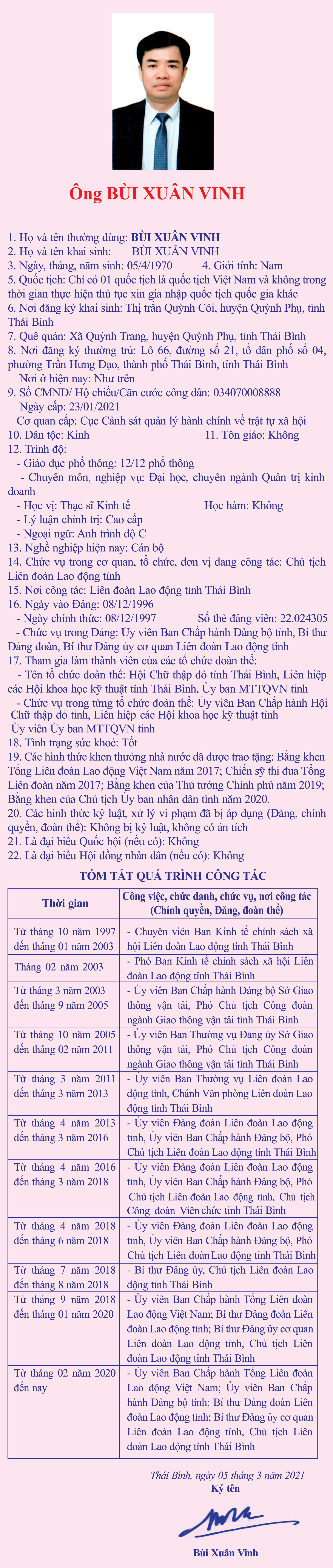 Tiểu sử, chương trình hành động của ông Bùi Xuân Vinh, Ủy viên Ban Chấp hành Đảng bộ tỉnh, Bí thư Đảng đoàn, Bí thư Đảng ủy, Chủ tịch Liên đoàn Lao động tỉnh; Ủy viên Ban Chấp hành Hội chữ thập đỏ tỉnh; Ủy viên Ban Chấp hành Liên hiệp các hội khoa học và kỹ thuật tỉnh, ứng cử đại biểu HĐND tỉnh khóa XVII, nhiệm kỳ 2021 - 2026, đơn vị bầu cử số 3, huyện Quỳnh Phụ.