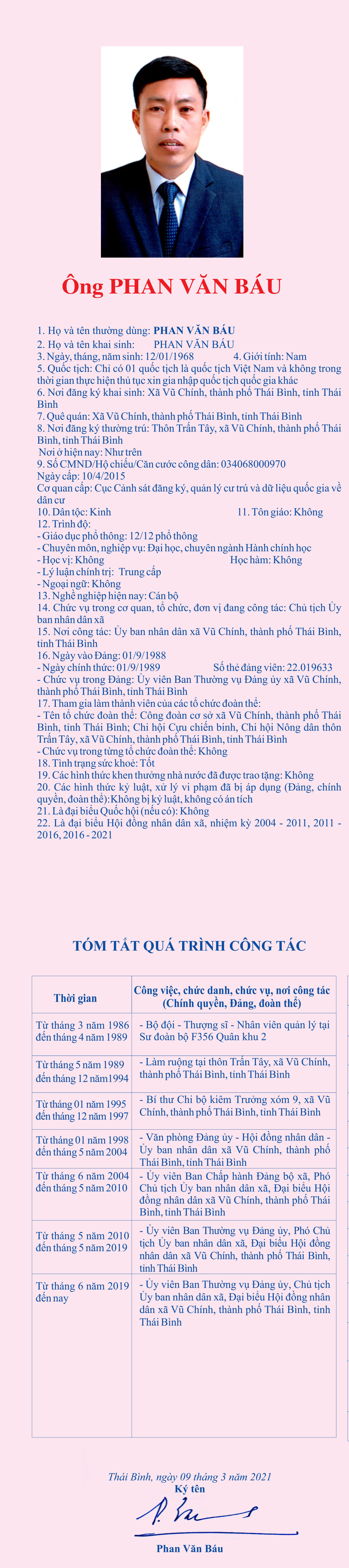 Tiểu sử, chương trình hành động của ông Phan Văn Báu, Ủy viên Ban Thường vụ Đảng ủy, Chủ tịch Ủy ban nhân dân xã Vũ Chính, thành phố Thái Bình, ứng cử đại biểu HĐND tỉnh khóa XVII, nhiệm kỳ 2021 - 2026, đơn vị bầu cử số 15, thành phố Thái Bình.
