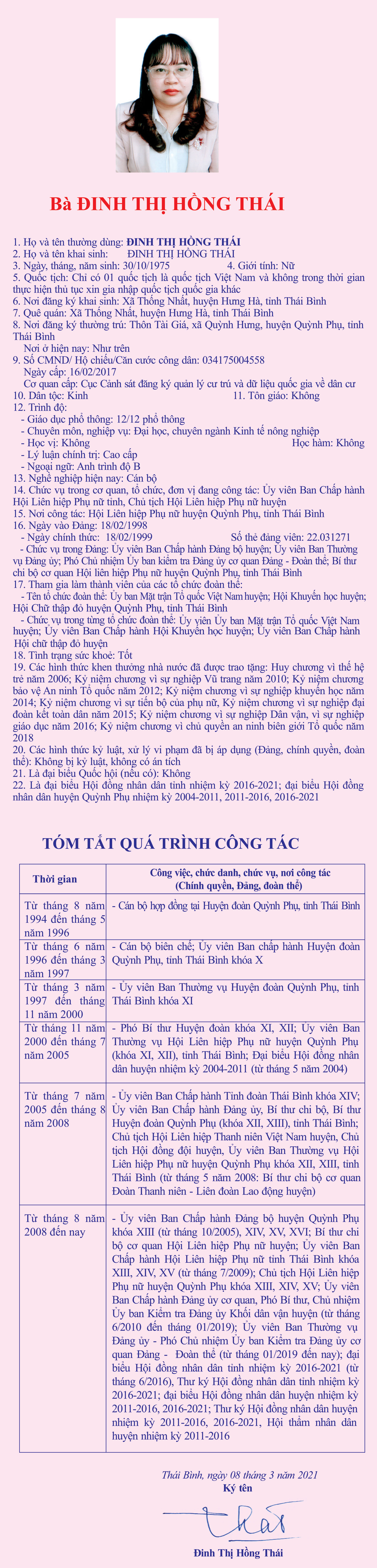 Tiểu sử, chương trình hành động của bà Đinh Thị Hồng Thái, Chủ tịch Hội Liên hiệp Phụ nữ huyện Quỳnh Phụ, ứng cử đại biểu HĐND tỉnh khóa XVII