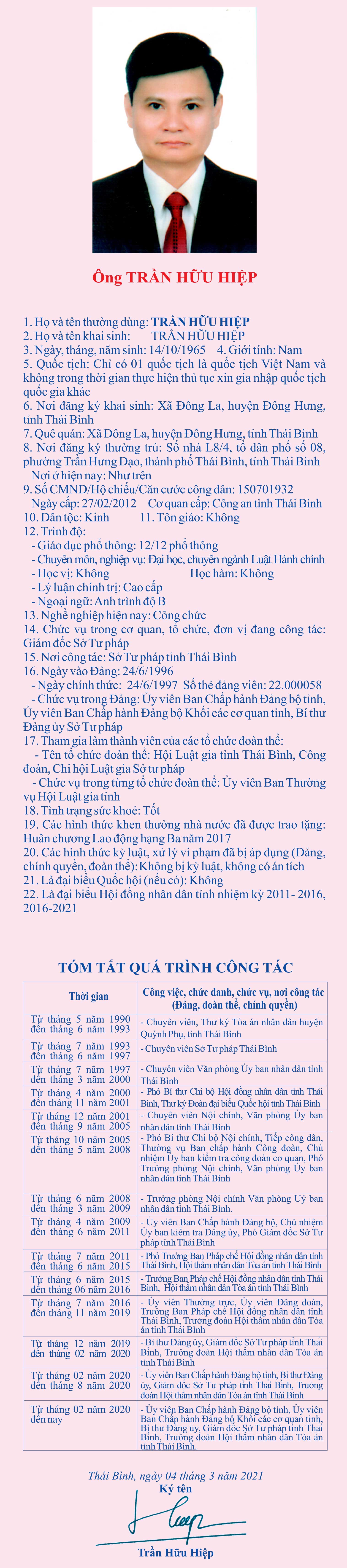 Tiểu sử, chương trình hành động của ông Trần Hữu Hiệp, Tỉnh ủy viên, Giám đốc Sở Tư pháp tỉnh Thái Bình, ứng cử đại biểu HĐND tỉnh khóa XVII