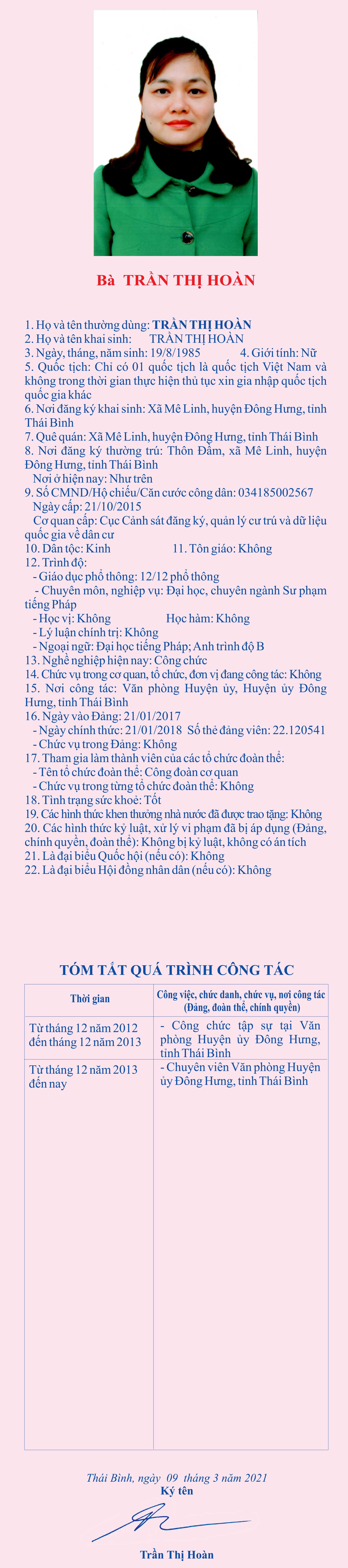 Tiểu sử, chương trình hành động của bà Trần Thị Hoàn, chuyên viên Văn phòng Huyện ủy huyện Đông Hưng, ứng cử đại biểu HĐND tỉnh khóa XVII, nhiệm kỳ 2021 - 2026, đơn vị bầu cử số 6, huyện Đông Hưng.