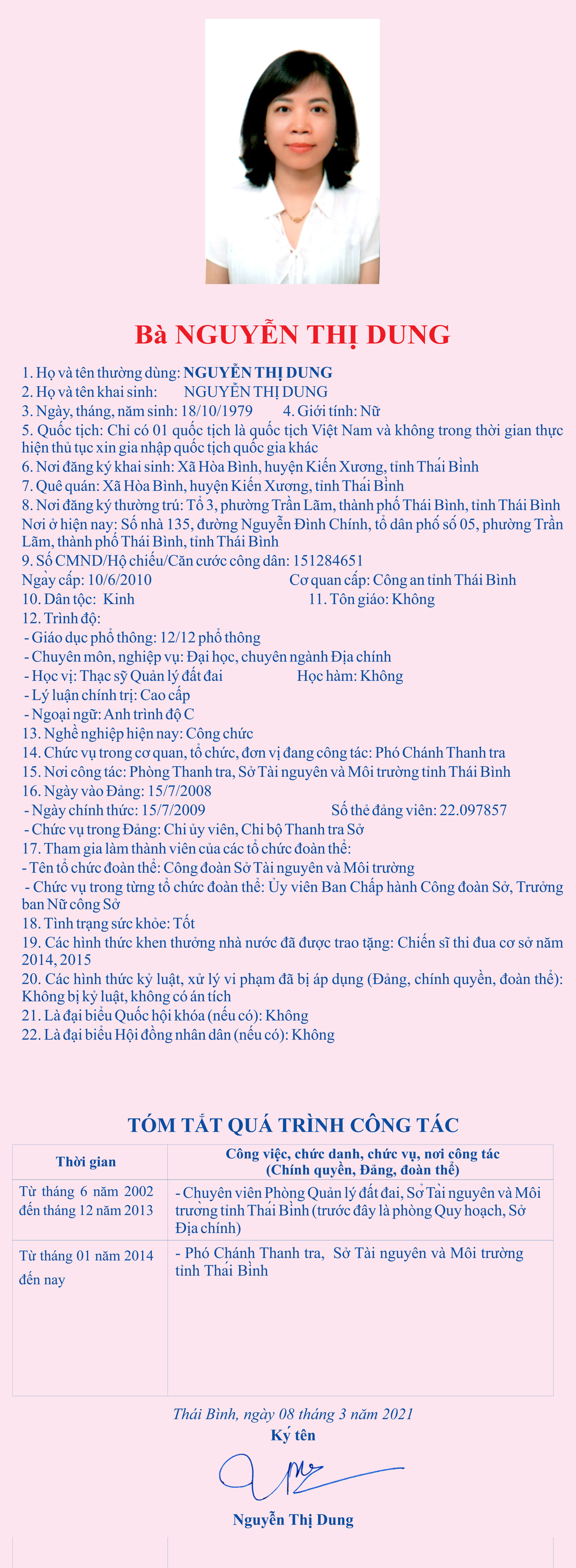 Tiểu sử, chương trình hành động của bà Nguyễn Thị Dung, Chi ủy viên Chi bộ Thanh tra Sở, Phó chánh Thanh tra Sở Tài nguyên và Môi trường; Ủy viên Ban Chấp hành Công đoàn Sở, ứng cử đại biểu HĐND tỉnh khóa XVII, nhiệm kỳ 2021 - 2026, đơn vị bầu cử số 16, thành phố Thái Bình.
