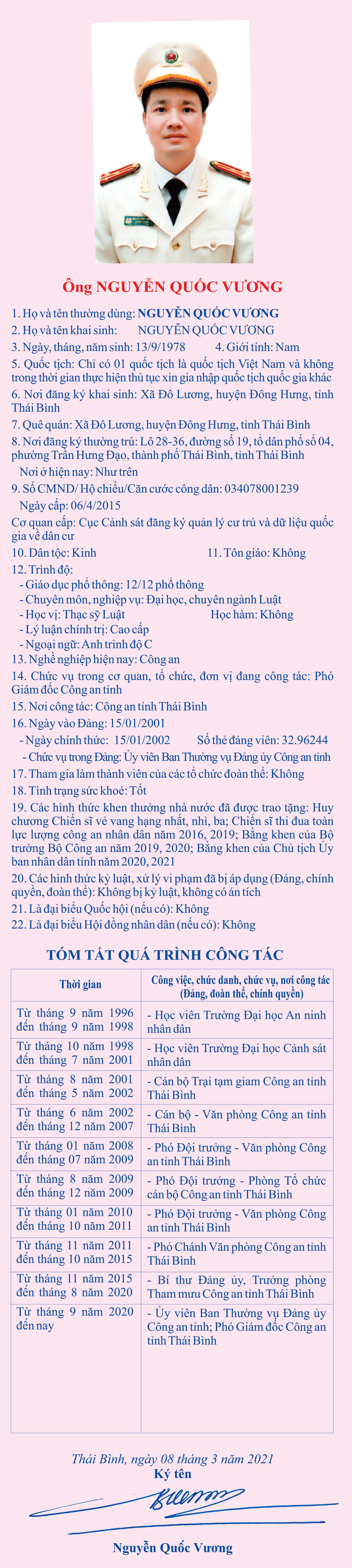 Tiểu sử, chương trình hành động của ông Nguyễn Quốc Vương, Ủy viên Ban Thường vụ Đảng ủy Công an, Phó Giám đốc Công an tỉnh, ứng cử đại biểu HĐND tỉnh khóa XVII, nhiệm kỳ 2021 - 2026, đơn vị bầu cử số 7, huyện Thái Thụy.
