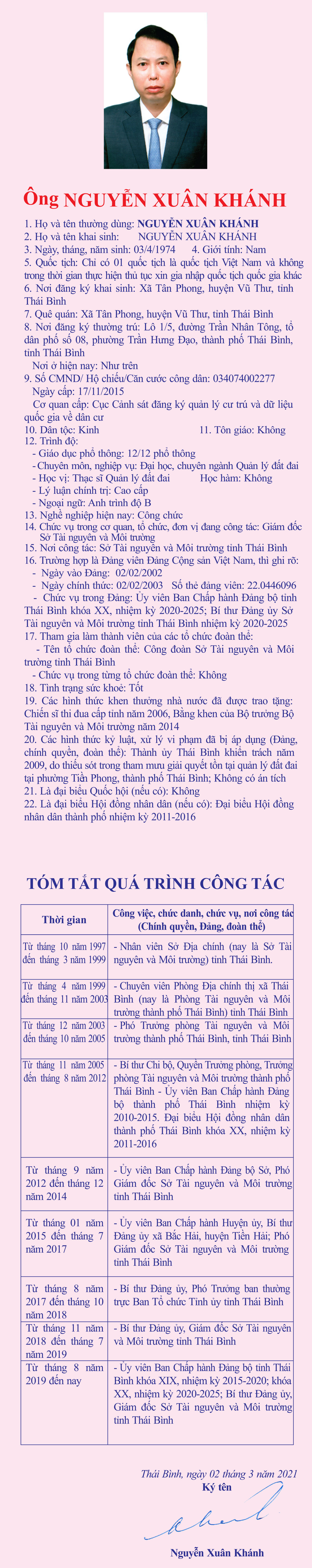 Tiểu sử, chương trình hành động của ông Nguyễn Xuân Khánh, Tỉnh ủy viên, Bí thư Đảng ủy, Giám đốc Sở Tài nguyên và Môi trường, ứng cử đại biểu HĐND tỉnh khóa XVII, nhiệm kỳ 2021 - 2026, đơn vị bầu cử số 8, huyện Thái Thụy.