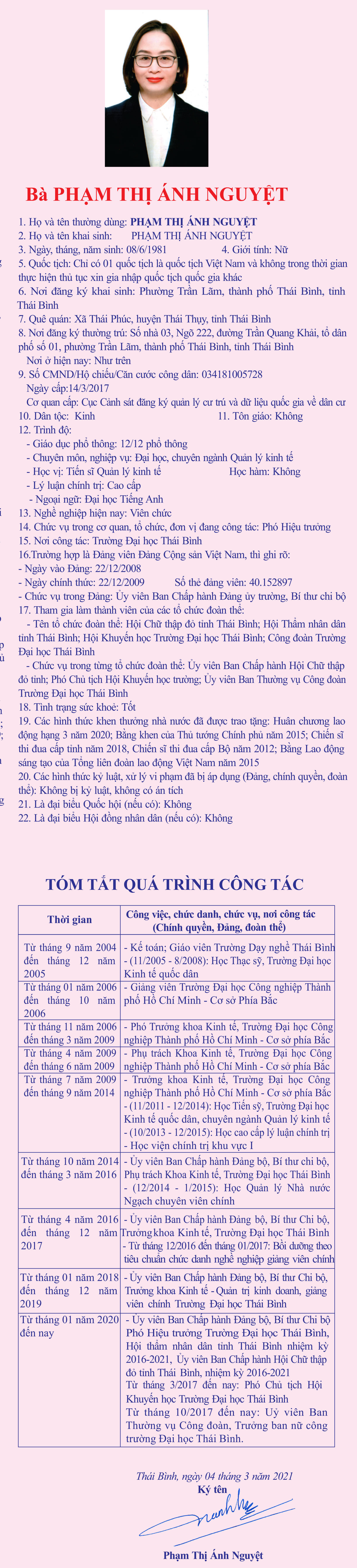 Tiểu sử, chương trình hành động của bà Phạm Thị Ánh Nguyệt, Ủy viên Ban Chấp hành Đảng bộ trường, Bí thư Chi bộ, Phó Hiệu trưởng Trường Đại học Thái Bình; Ủy viên Ban Chấp hành Hội Chữ thập đỏ tỉnh; Phó Chủ tịch Hội Khuyến học trường, Ủy viên Ban Thường vụ Công đoàn trường; Hội thẩm nhân dân, ứng cử đại biểu HĐND tỉnh khóa XVII, nhiệm kỳ 2021 - 2026, đơn vị bầu cử số 8, huyện Thái Thụy.