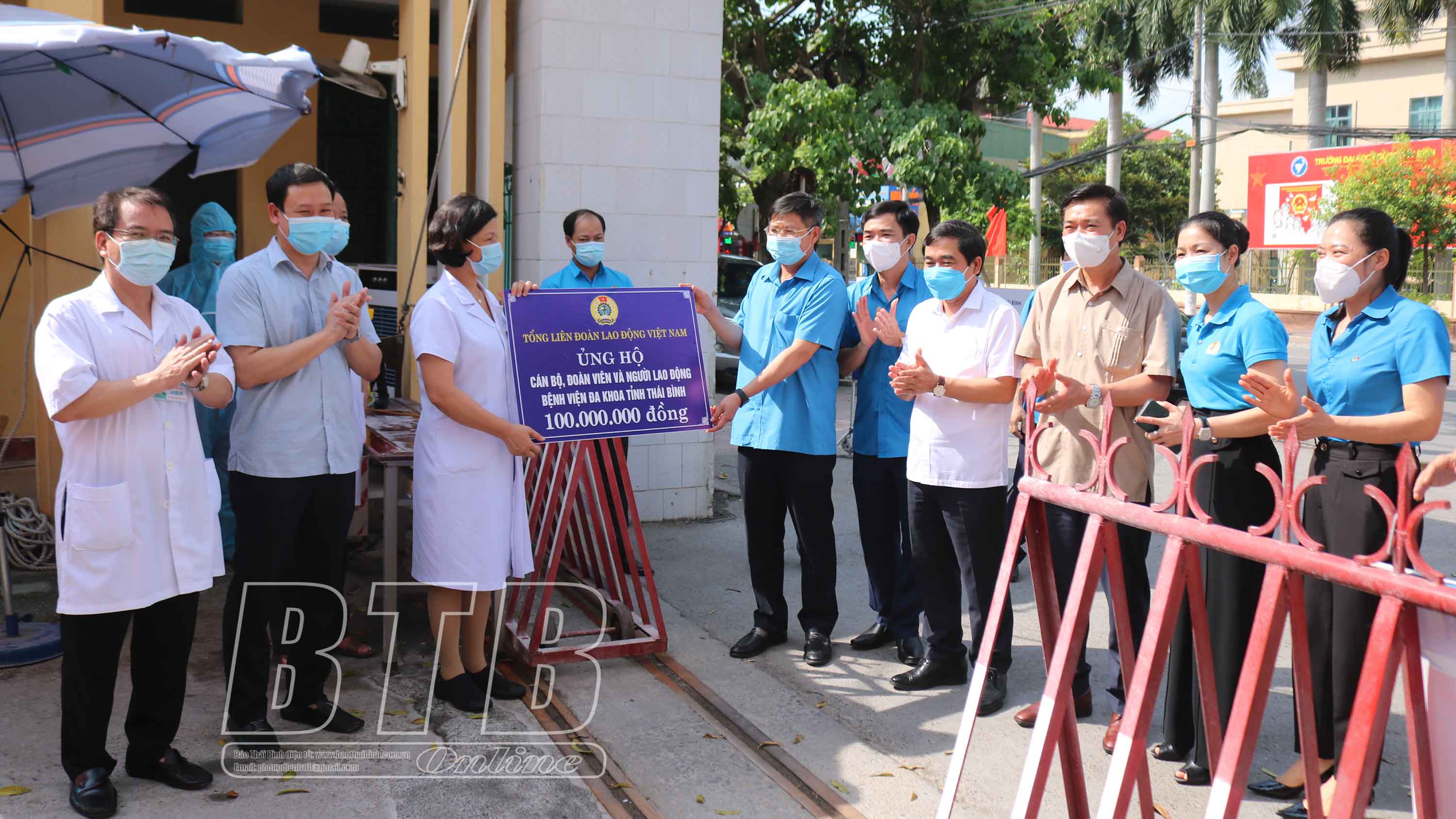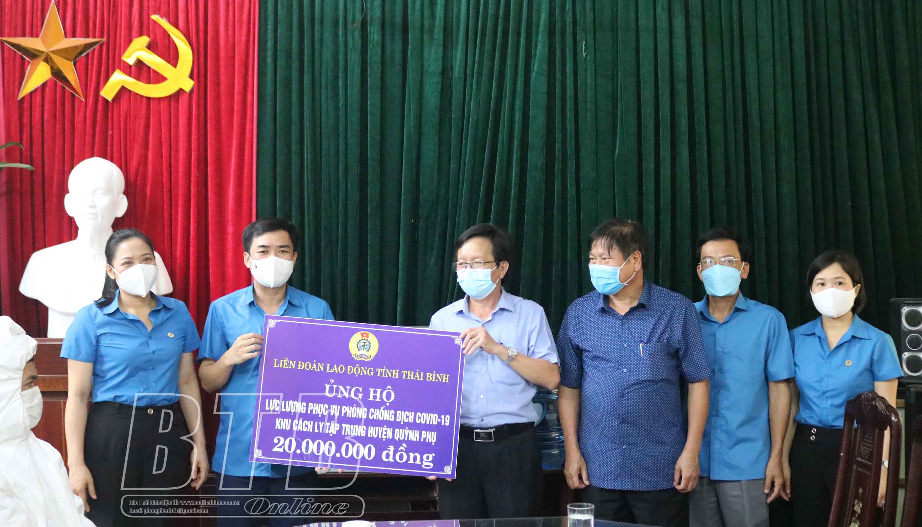 Buổi chiều cùng ngày, Liên đoàn Lao động tỉnh đã đến thăm, động viên và trao số tiền 20 triệu đồng tới đội ngũ cán bộ, CNVCLĐ Trung tâm Y tế huyện Quỳnh Phụ thực hiện nhiệm vụ phòng, chống dịch và 30 triệu đồng cho lực lượng làm nhiệm phòng, chống dịch xã An Thái (Quỳnh Phụ).