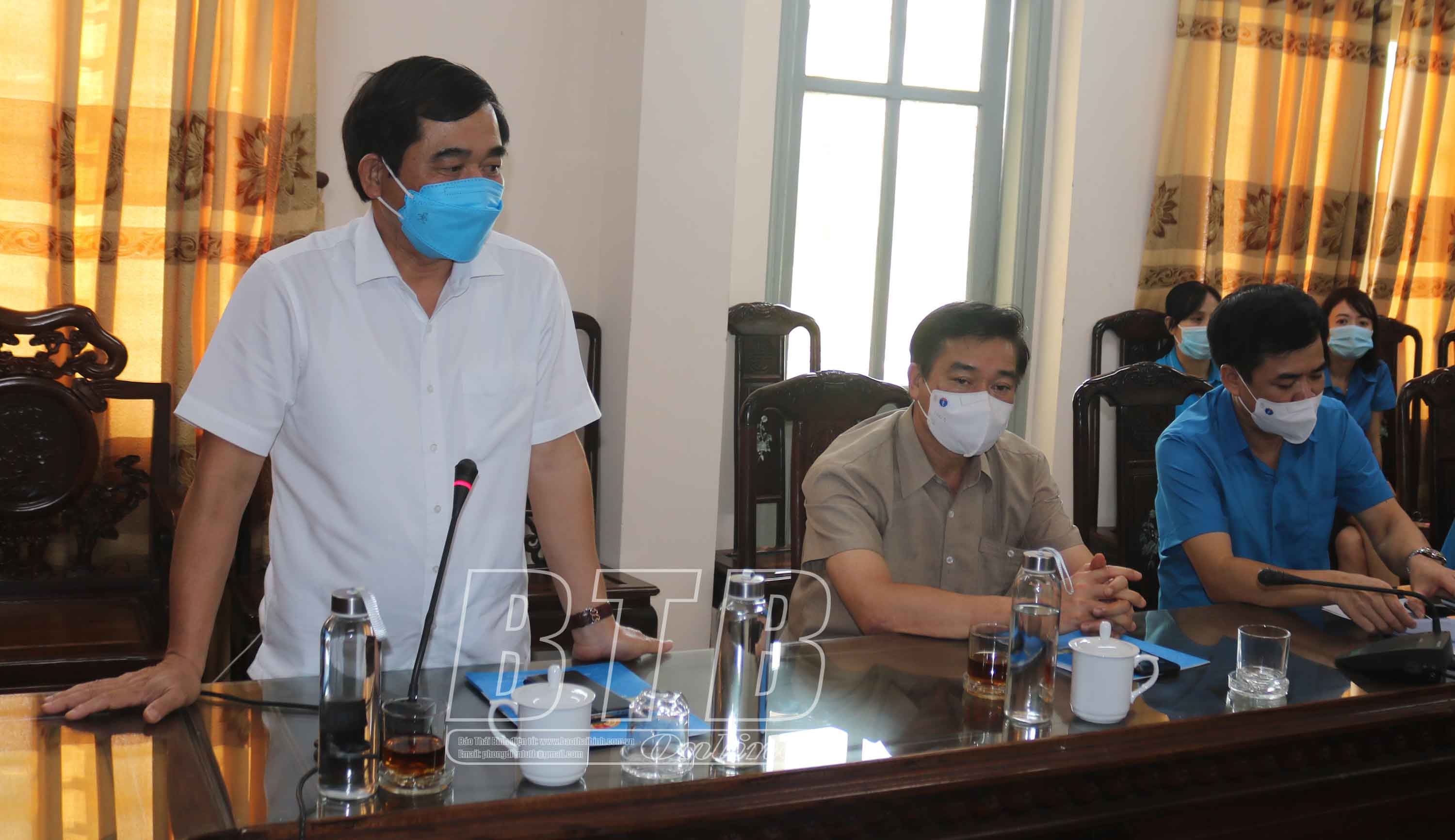 Phát biểu tại buổi làm việc, đồng chí Phan Văn Anh, Phó Chủ tịch Tổng Liên đoàn Lao động Việt Nam ghi nhận và đánh giá cao sự chủ động của các cấp công đoàn tỉnh Thái Bình trong việc triển khai kịp thời các biện pháp phòng, chống dịch Covid-19, bảo đảm an toàn, sức khỏe, thu nhập cho CNVCLĐ, ổn định quan hệ lao động tại doanh nghiệp. Đồng chí Phó Chủ tịch Tổng Liên đoàn Lao động Việt Nam yêu cầu các cấp công đoàn tỉnh Thái Bình tiếp tục đẩy mạnh công tác tuyên truyền trong CNVCLĐ, thực hiện nghiêm khuyến cáo "5K" của Bộ Y tế. Tiếp tục rà soát để có biện pháp chăm lo, bảo đảm quyền lợi cho người lao động, đặc biệt người lao động ở khu vực bị phong tỏa, cách ly. Tuyệt đối không chủ quan, lơ là, mất cảnh giác, thường xuyên theo dõi diễn biến tình hình dịch để có biện pháp phòng, chống dịch kịp thời; đồng thời nắm bắt tư tưởng trong CNVCLĐ, bảo đảm an toàn trong công tác bầu cử.
