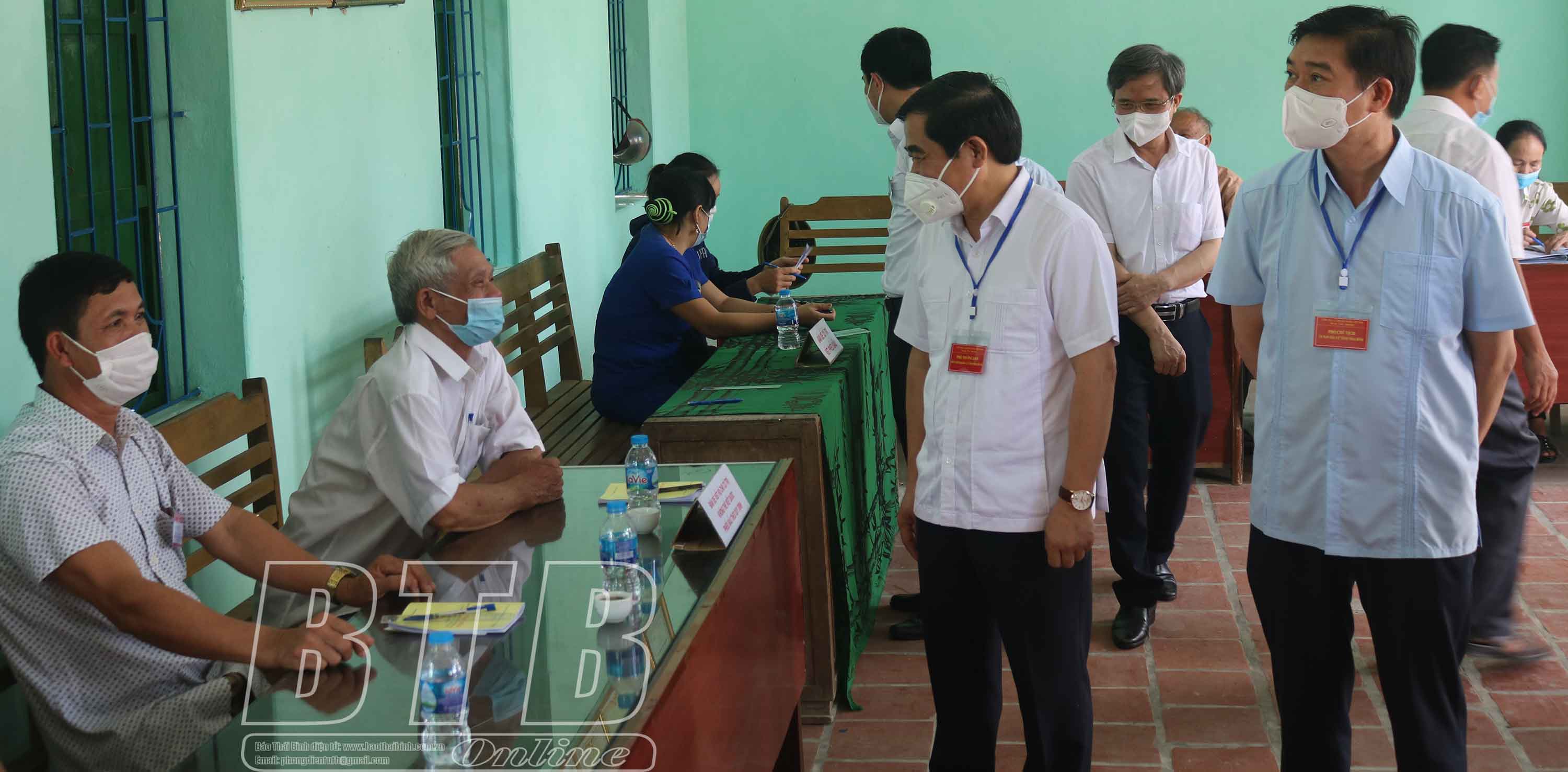 Đồng chí Nguyễn Tiến Thành, Phó Bí thư thường trực Tỉnh ủy, Chủ tịch HĐND tỉnh, Phó Trưởng ban chỉ đạo bầu cử tỉnh và các đồng chí lãnh đạo tỉnh kiểm tra công tác bầu cử tại khu vực bỏ phiếu số 2, xã Dũng Nghĩa (Vũ Thư).