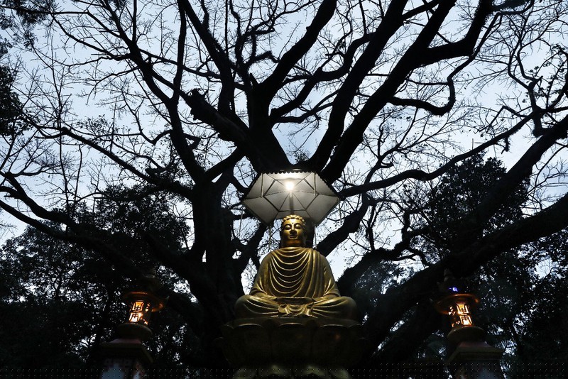 Bức tượng Đức Phật dưới tán bồ đề bên cánh rừng trăm tuổi lắng nghe cầu nguyện của muôn nỗi nhân gian.