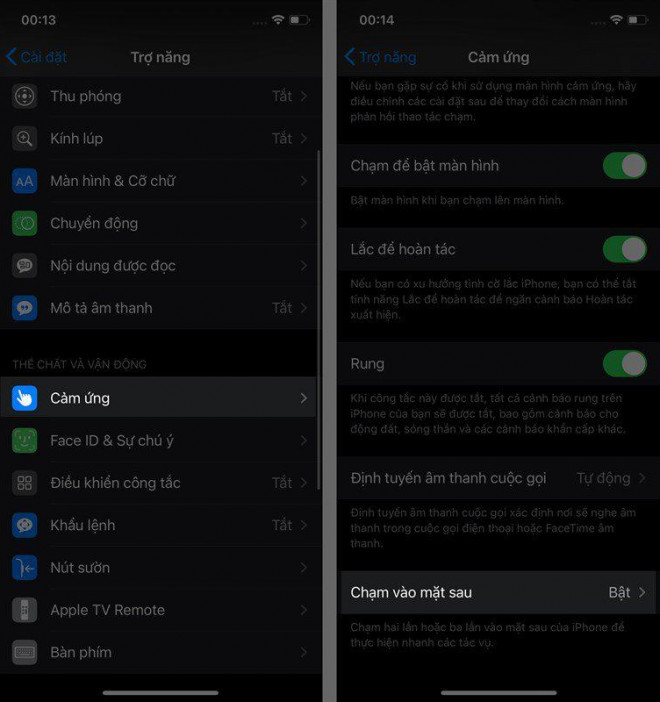 Sau đó bạn sẽ thấy ở dưới cùng có thêm mục Chạm vào mặt sau > Có 2 tùy chọn là chạm 2 lần và chạm 3 lần.