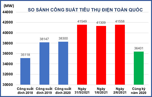 Như vậy, nếu so với mức đỉnh năm 2020 thì công suất đỉnh toàn quốc ngày 2/6/2021 đã cao hơn tới hơn 3200 MW tức là gần tương đương với mức tổng công suất của cả nhà máy thuỷ điện Sơn La (2400 MW) và thuỷ điện Lai Châu (1200 MW).