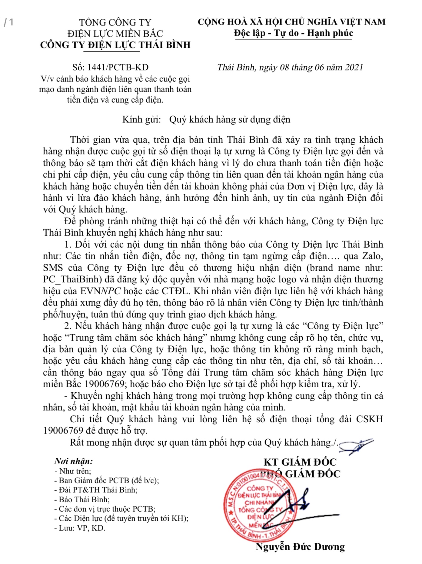 Cảnh báo khách hàng về các cuộc gọi mạo danh ngành điện liên quan thanh toán tiền điện và cung cấp điện